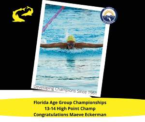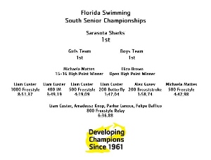 With twelve SR Championships since 2014 the Sarasota Sharks capture number thirteen winning all three titles; Men's, Women's and Combined Championships. The Sharks Combined Team won by over 1000 points by outscoring T2 Aquatics 2570 to 1420. Sharks' Michaela Mattes and Liza Brown both won high-point for their respective age group. Liam Custer won all four of his events, along with Alex Gusev and Michaela Mattes taking 1st in the 200 BR and 500 FR respectively. Sharks' 800 Freestyle Men's Relay also took gold shattering the state record and finishing...