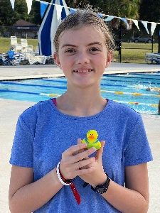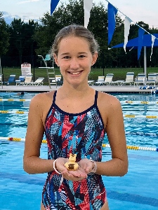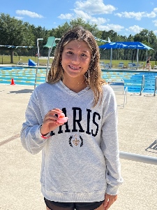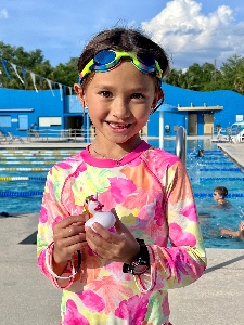 Sydney McFarland was chosen as October's Swimmer of the Month due to her dedication and enthusiasm at practice despite being new to our team. Sydney's coach says she always shows up and works hard at practice every day. Sydney is in Age Group 2. She attends Howard Middle School. Outside of swimming, Sydney enjoys playing Zelda and the oboe, and listening to pop music. Her favorite food is chicken puffs. Frozen 2 is her favorite movie, and her dream is to be the next J.K. Rowling!