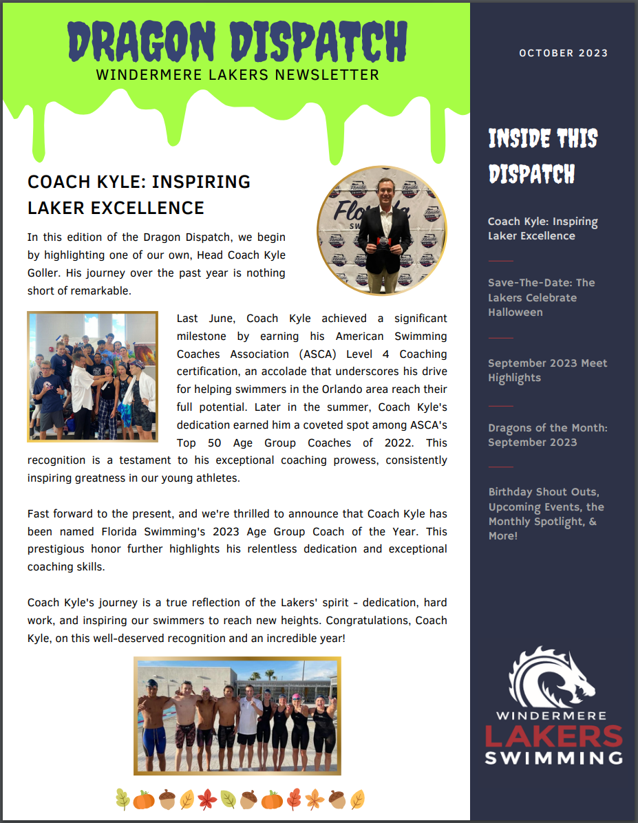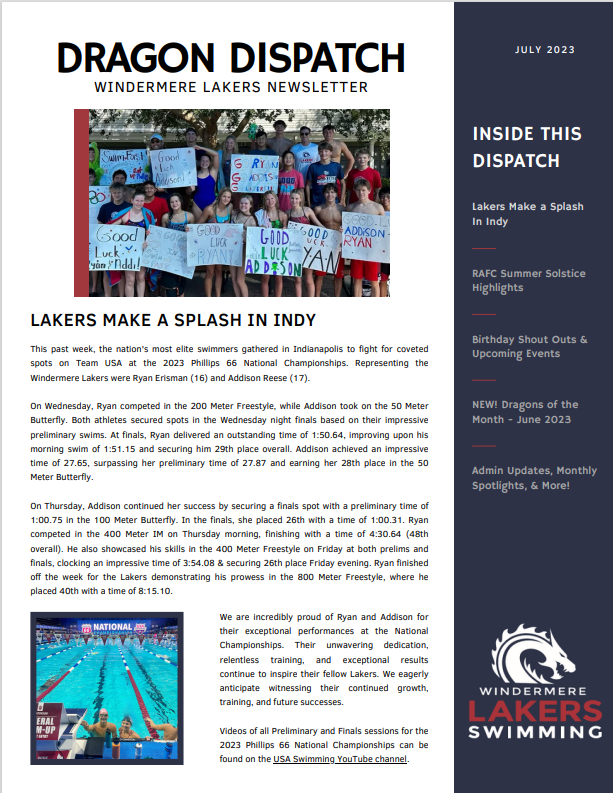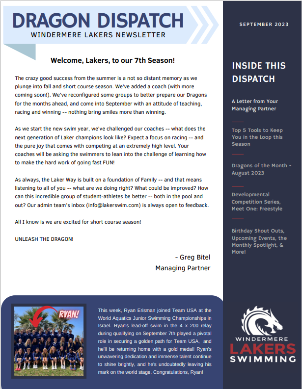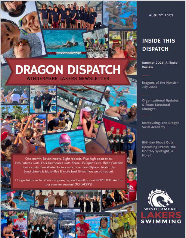 Embark on a journey through the chapters of Windermere Lakers Aquatics history with our newsletter archives. Our team has a rich legacy, we're excited to share this legacy within our newsletter collection. These editions of the Dragon Dispatch will offer a glimpse into the memorable moments, achievements, and stories that have shaped our vibrant swim community. Stay tuned as we build upon this archive, celebrating the dedication and passion of our Lakers family.
