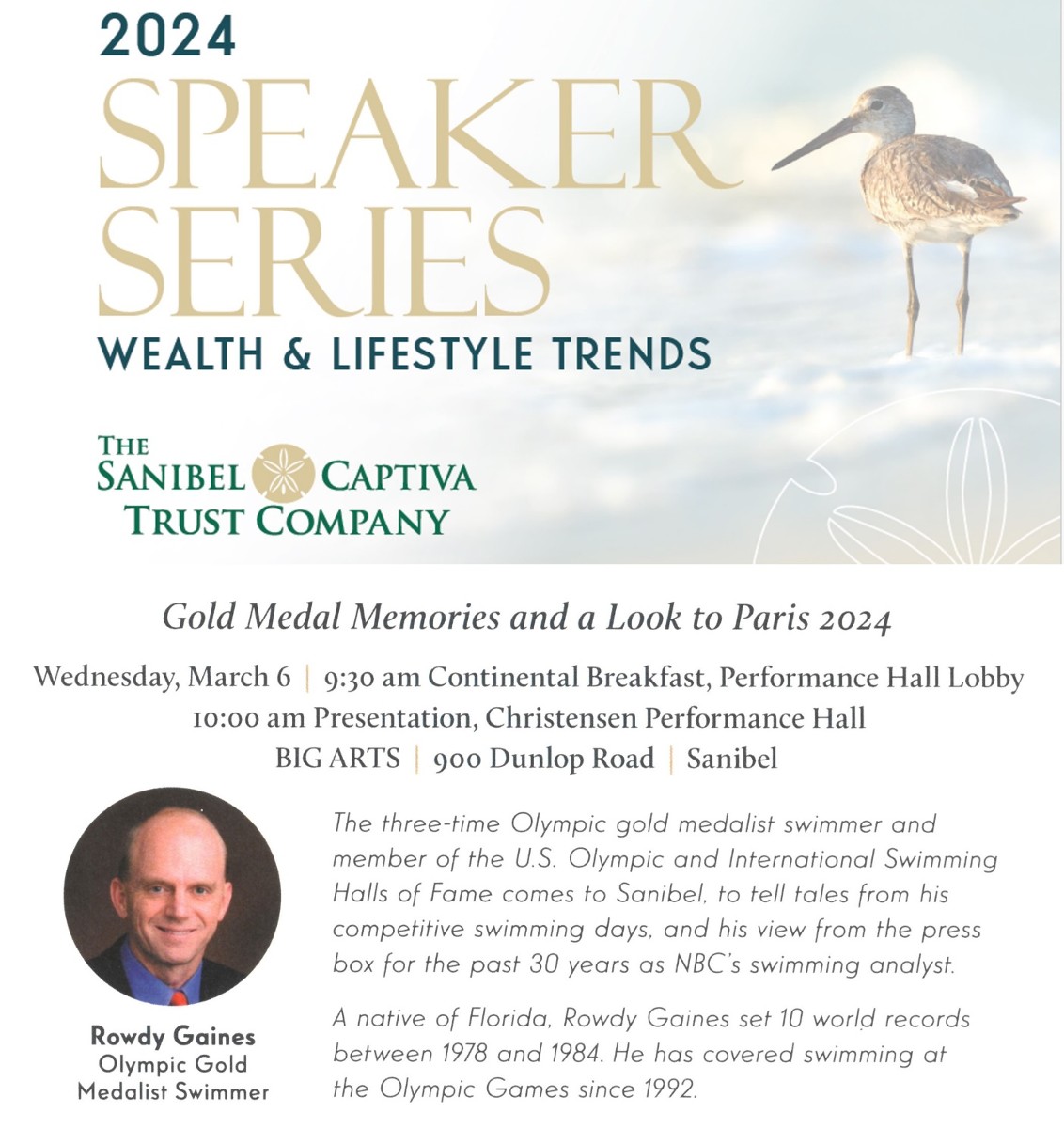 Join us for this free community event presented by The Sanibel Captiva Trust Company on March 6th at BIG ARTS, kicking off with breakfast at 9:30am, with the presentation starting at 10am.