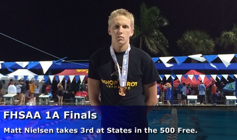 Senior Matt Nielsen finished 3rd in the 500 Free to make his first medal stand appearance at the FHSAA 1A State Finals with a 4:29.19. He also won the Consolation Final of the 200 Free with a 1:41.56. Prelims: Matt Nielsen swam personal best times in the prelim heats of the FHSAA Class 1A Finals in the 200 Free with a 1:41.50 (9th), and the 500 Free with a 4:32.09 (5th). Congrats to Matt on an outstanding 2013 high school season. Well done!!! Live Results can be found on Meet...