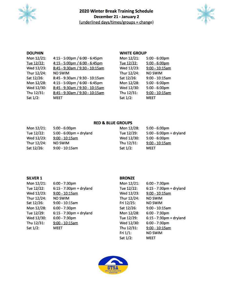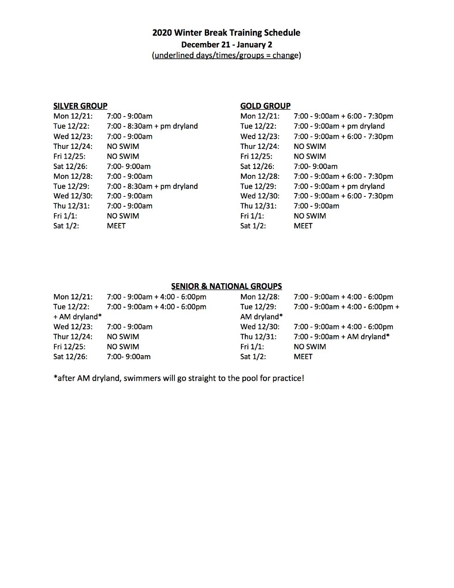 Here is the Winter Break practice schedule for this year! Winter Break is December 21 - January 2, changes to your swimmers schedules are underlined. If the group name is underlined that means the whole schedule is changed.