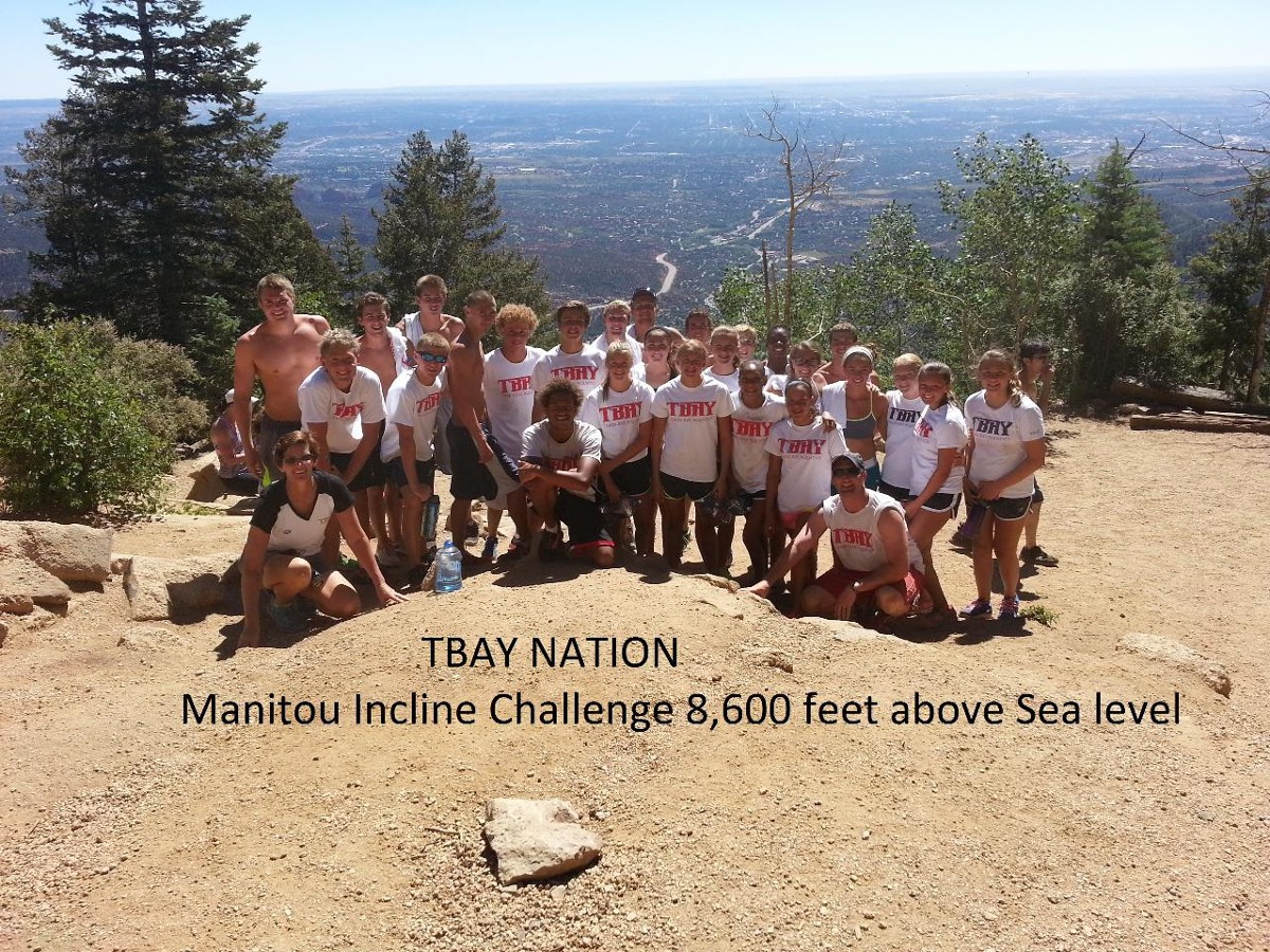 The swimmers did an outstanding job of coming together and really working as a TEAM with each and every challenge that we threw at them. We had 28 athletes and Coaches climb the Manitou Incline (a rise in elevation from 6,500 to 8,600 ft above sea level), every one making it to the top of the Mountain. Another program training out at the USOTC had 41 swimmers on the trip, and just 13 made it to the top of the Mountain. I thought that speaks volumes of the TEAMWORK and Committment to Excellence our kids had to achieve the Goal! We had a lot of personal breakthroughs and revelations throughout the trip and Coach Sue, Chelsea and I can't be more proud of the young women and men that are now coming home Expected Leaders of TBAY Nation to help everyone understand the Importance of "Creating an Environment that Fosters Excellence . . . Everyday! I know the athletes are looking forward to bringing back their passion and knowledge they gained this trip to the entire program!