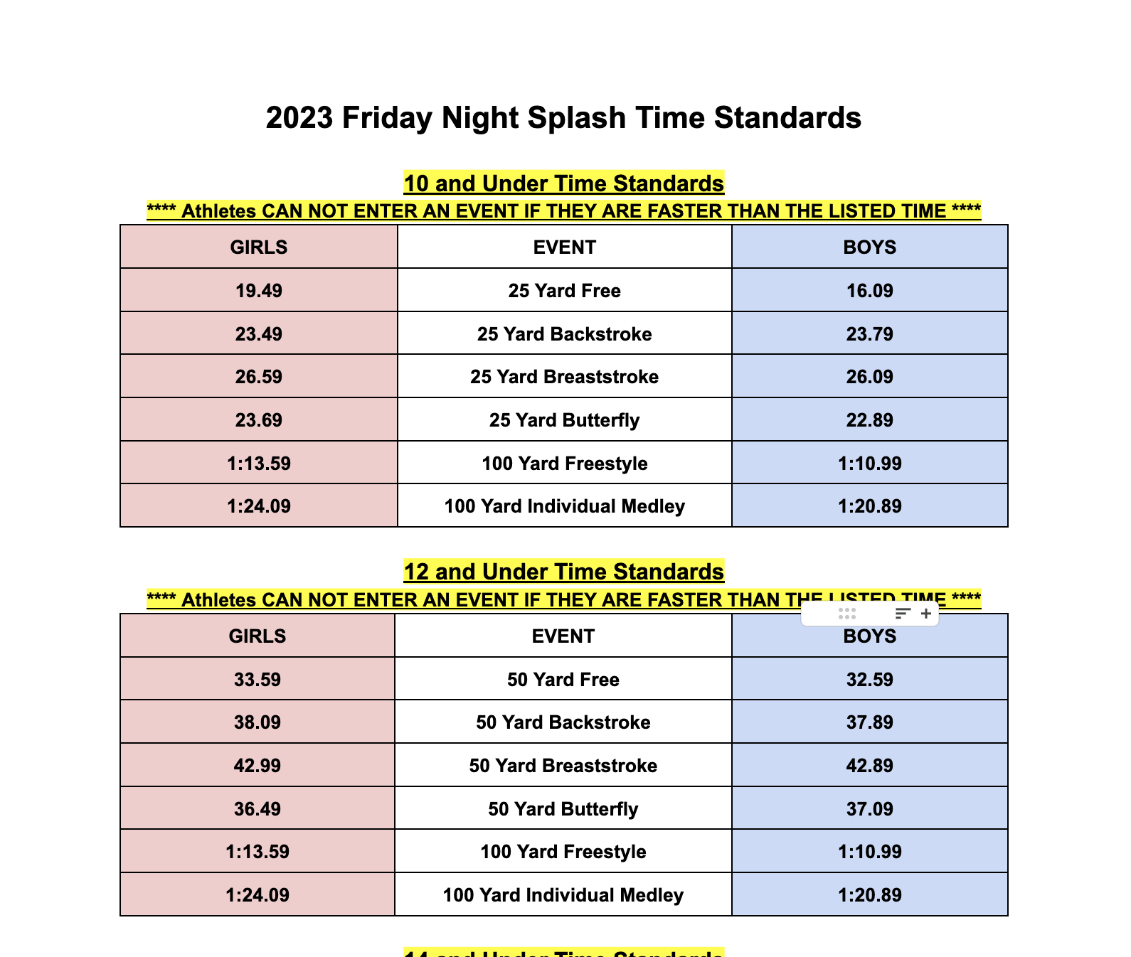 | 2024-2025 Friday Night Splash Time Standards (14 and Under) Championship Meet Time Standards 2022-2023 Para Time Standards (for disabled athletes) 2024 Short Course Age Group State Championships Time Standards (for 14 and under aged athletes) 2024 Short Course B Cut Championship Meet Time Standards (for 14 and under aged athletes) *** Please note that this meet is combined with the Age Group State Meet 10 and Under Session *** TYR Pro Swim Series Time Standards 2024 Futures Championships Time Standards 2024 USA Olympic Trials Time Standards |