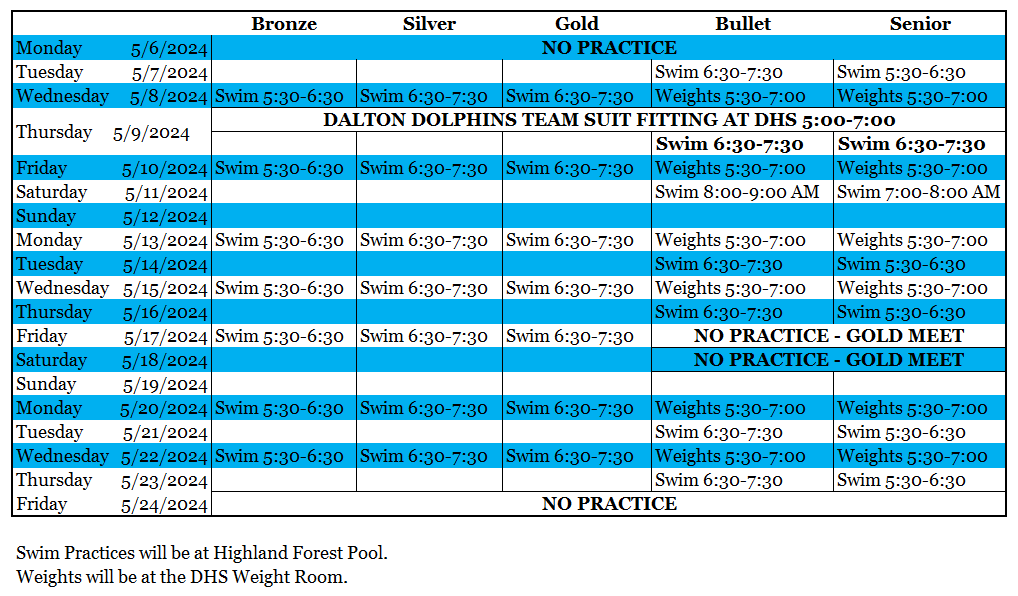 DPS is beginning to drain the pool to install the new filtration system. They tell us to expect the pool to open by June 1st. Highland Forest is generously allowing us to use their pool until May 24th. We are working on options to swim from May 24th to June 1st. The Highland Forest pool is not set up for competitive swimming, but it is big enough that we can run practice with some modifications. We must split up our groups to ensure we can run effective practices. We may adjust practices once we see how they are working. Directions to the Highland Forest Pool can be found HERE. The practice schedules are below: