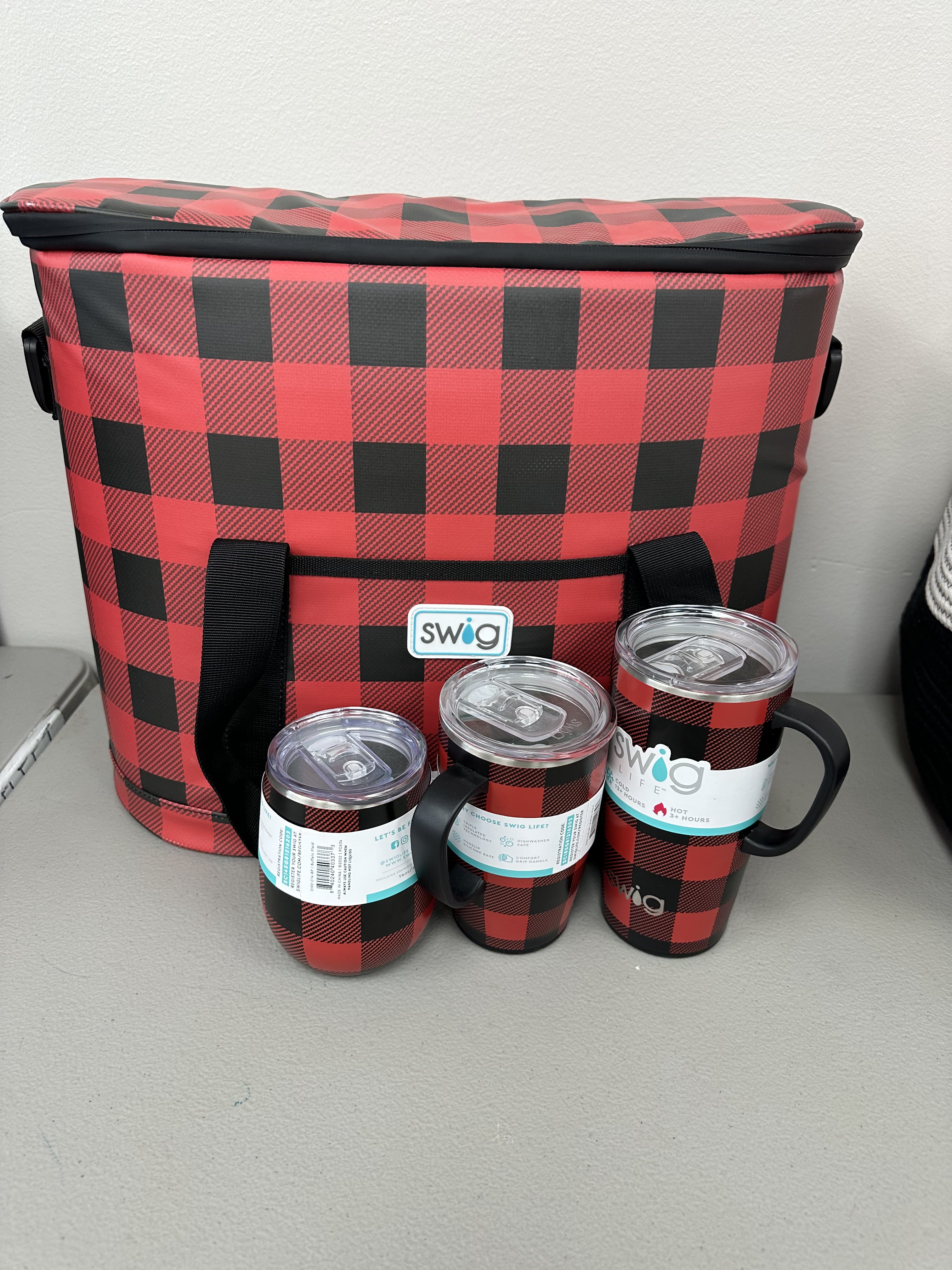 Swig Life Package - Red/Black Checkered Swig Life Insulated Bag, and 3x Matching Insulated Cups/Mugs