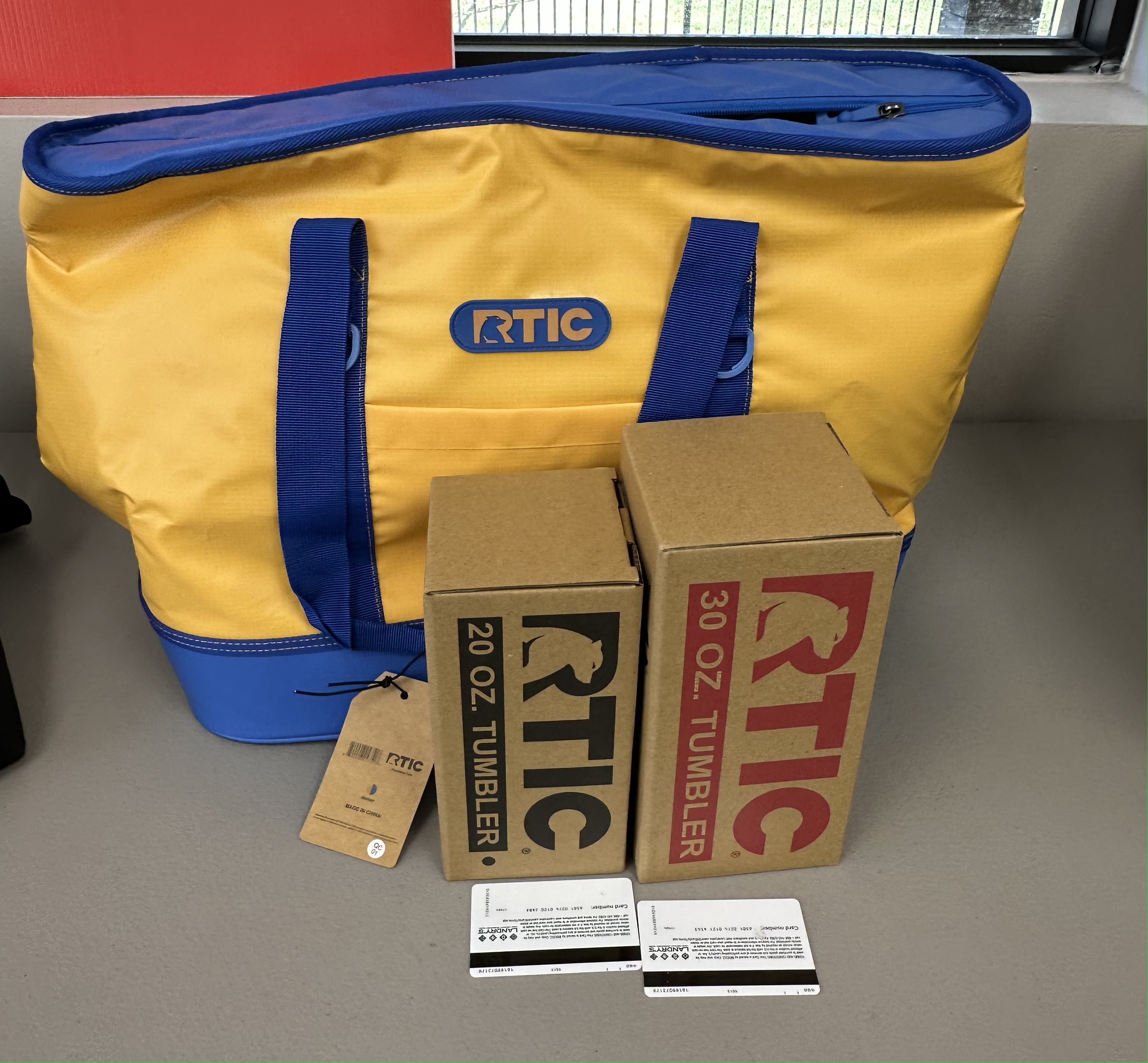 RTIC Package - Blue/Yellow RTIC Insulated Bag, 2x RTIC Tumblers, $50 Landry's Restaurants Gift Card
