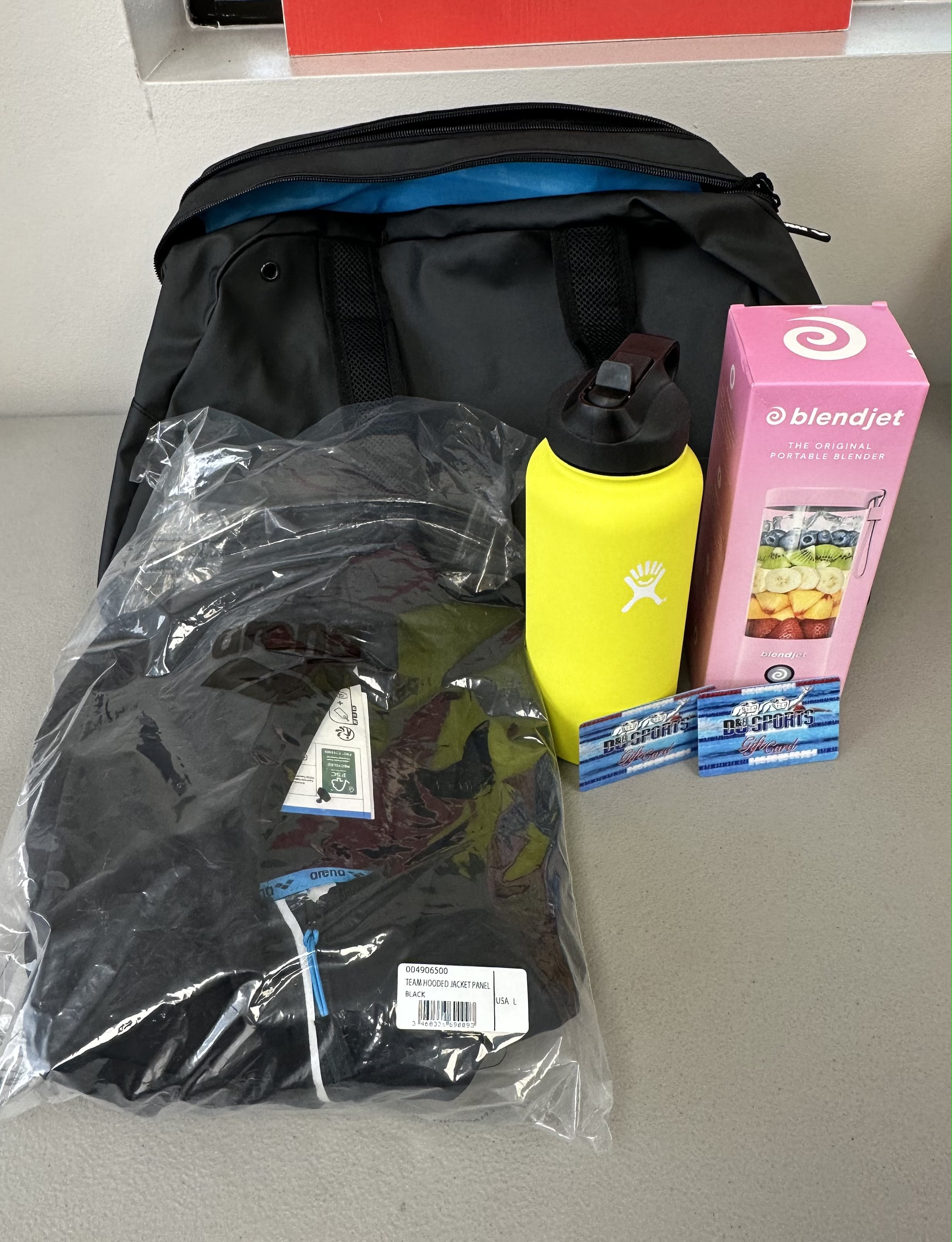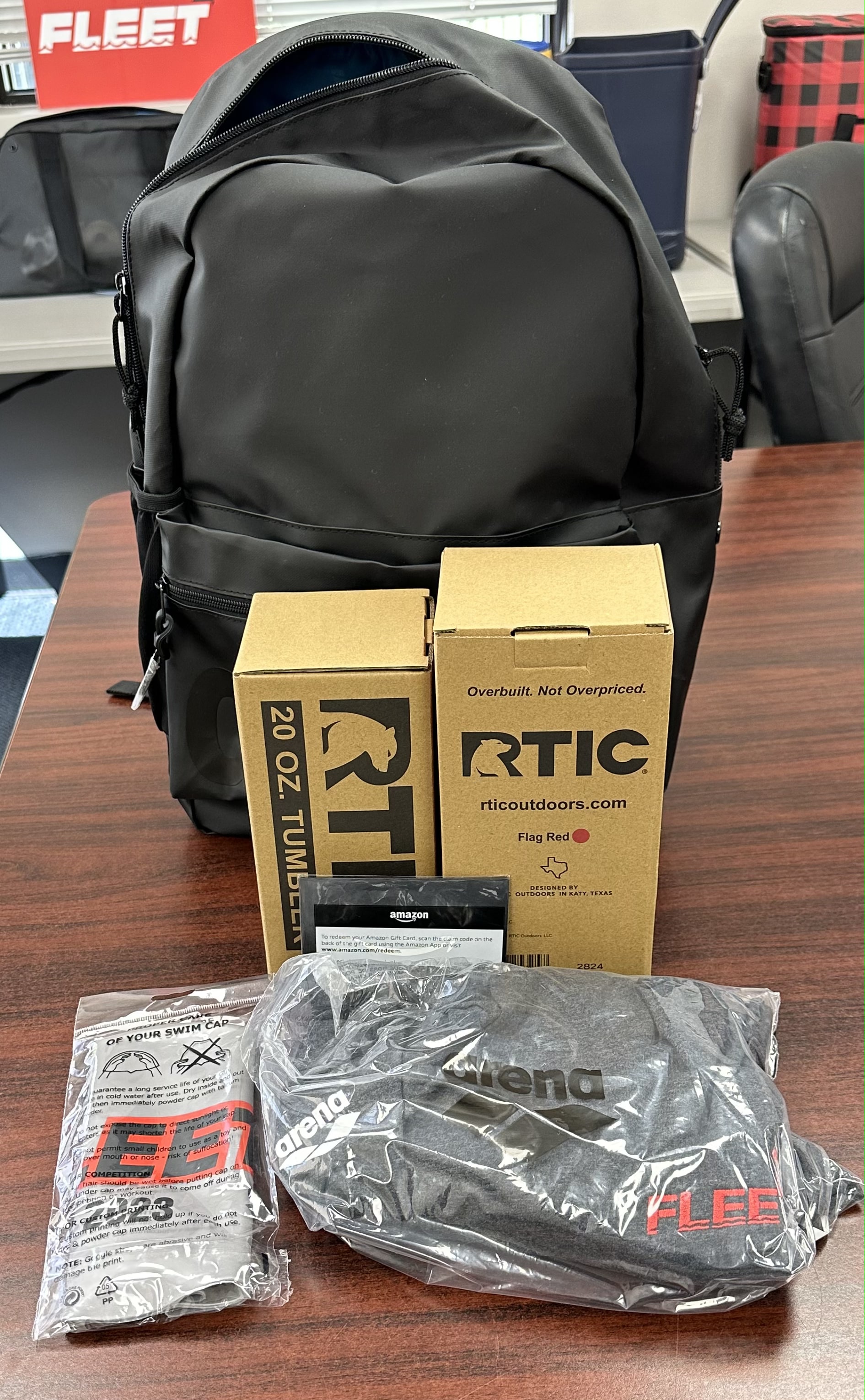 Backpack Package - Black Arena Backpack, 2x RTIC Tumblers, Special/Limited Edition Silver Fleet Swim Cap, XL Fleet T-Shirt Hoodie, $25 Amazon Gift Card