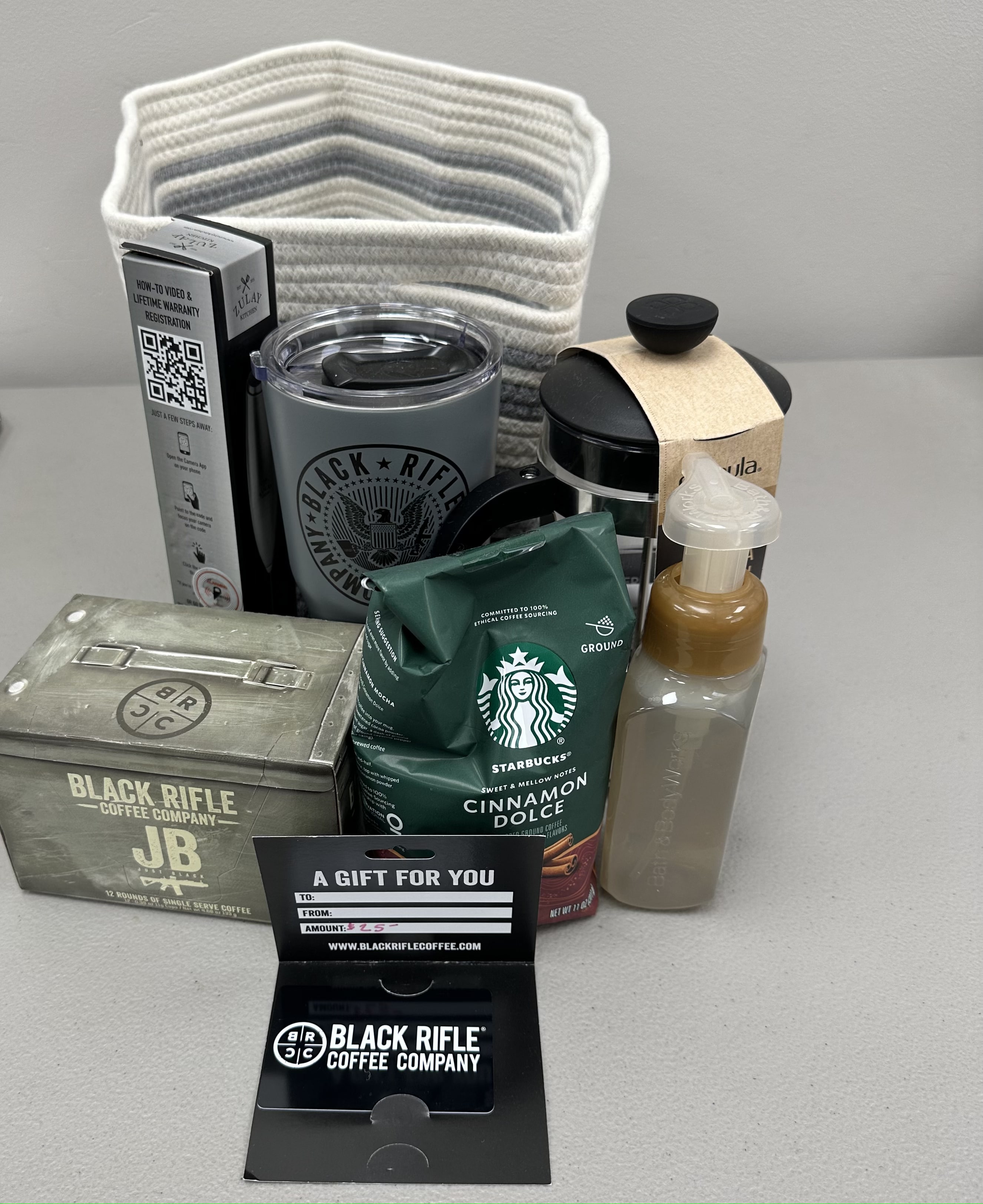 Coffee Package - Black Rifle Coffee Company - Medium Roast Single Serve, Starbucks Cinnamon Dolce Ground Coffee, Coffee Press, $25 Gift Card, Electric Milk Frother, Tumbler, Iced Caramel Swirl Hand Soap