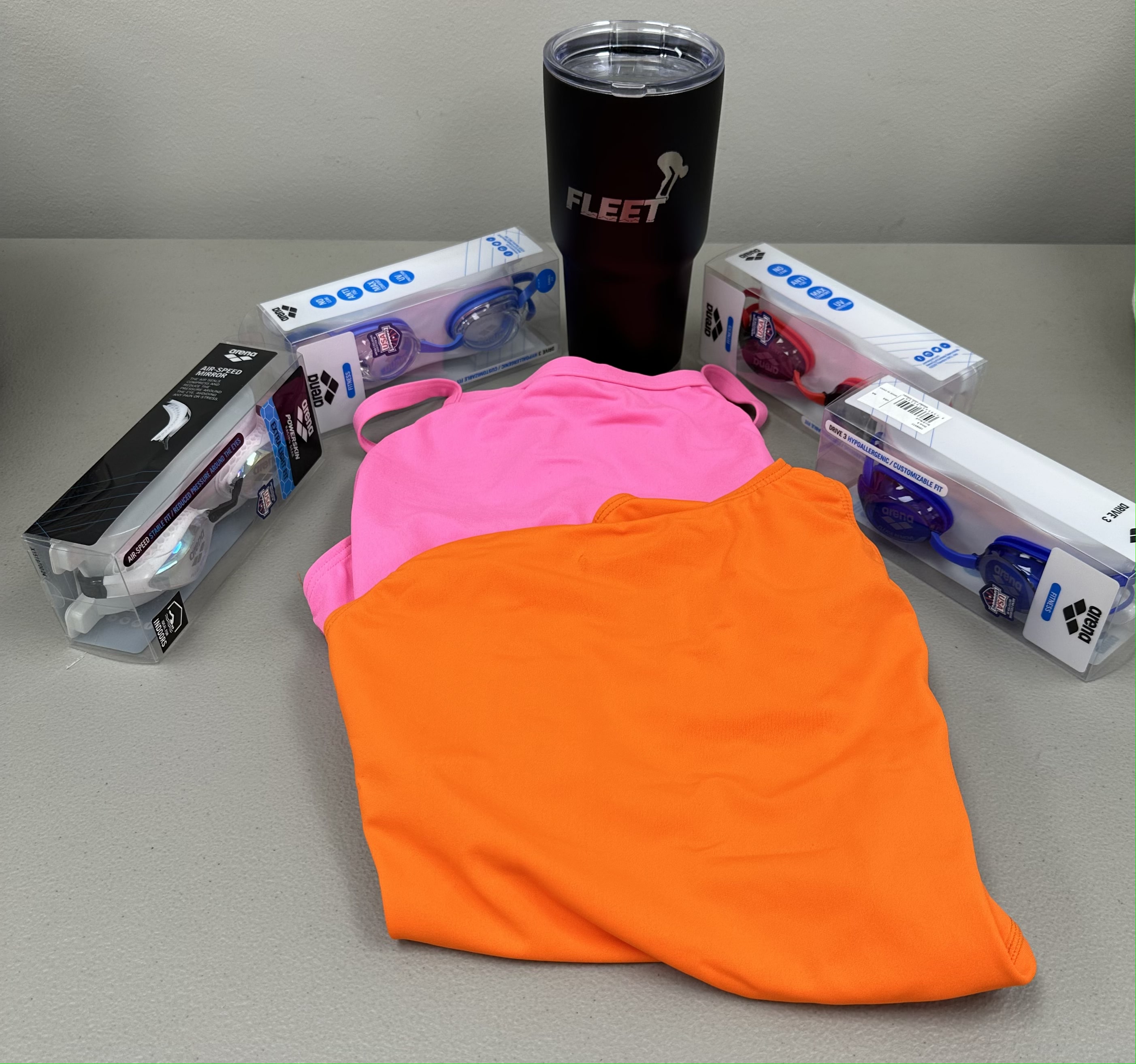 Arena Package #1 - 2x Female Arena Practice Suits - Size 30, 4 pair Arena Goggles, Fleet RTIC Tumbler