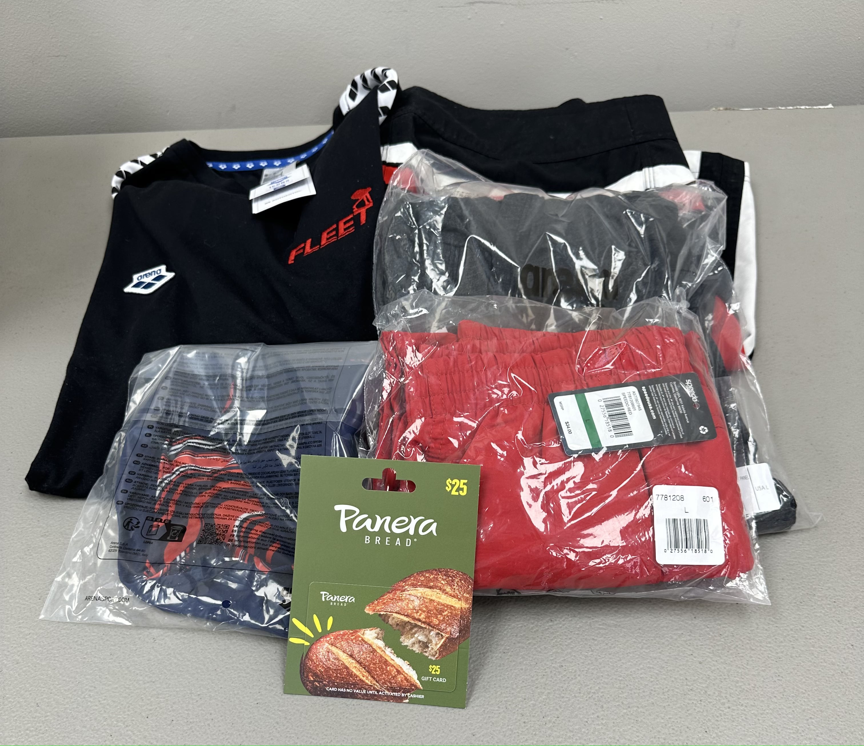 Fleet Package #1 - Men's Speedo Board Shorts - 32, Speedo Trunks - L, Arena T-shirt Hoodie - Large, Size 28 Arena Brief, $25 Panera Gift Card