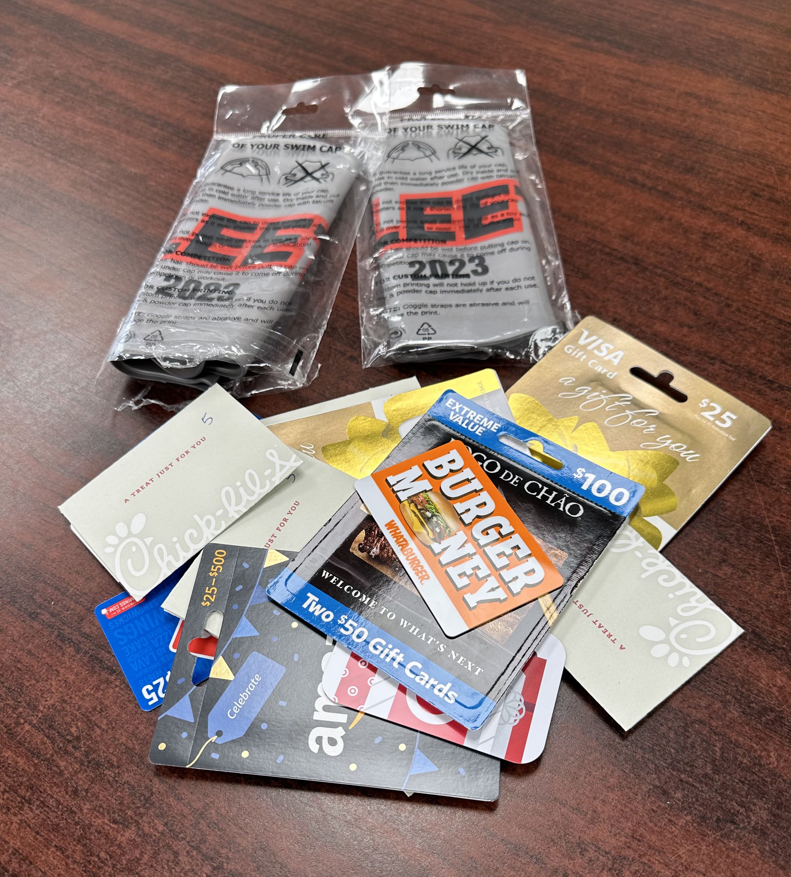 Gift Card Fun - 2x Special/Limited Edition Silver Fleet Swim Cap + over $500 in variety of gift cards (Chick-fil-A, Pappadeaux, Whataburger, Dominos, Amazon, Academy, Fogo de Chao & more)