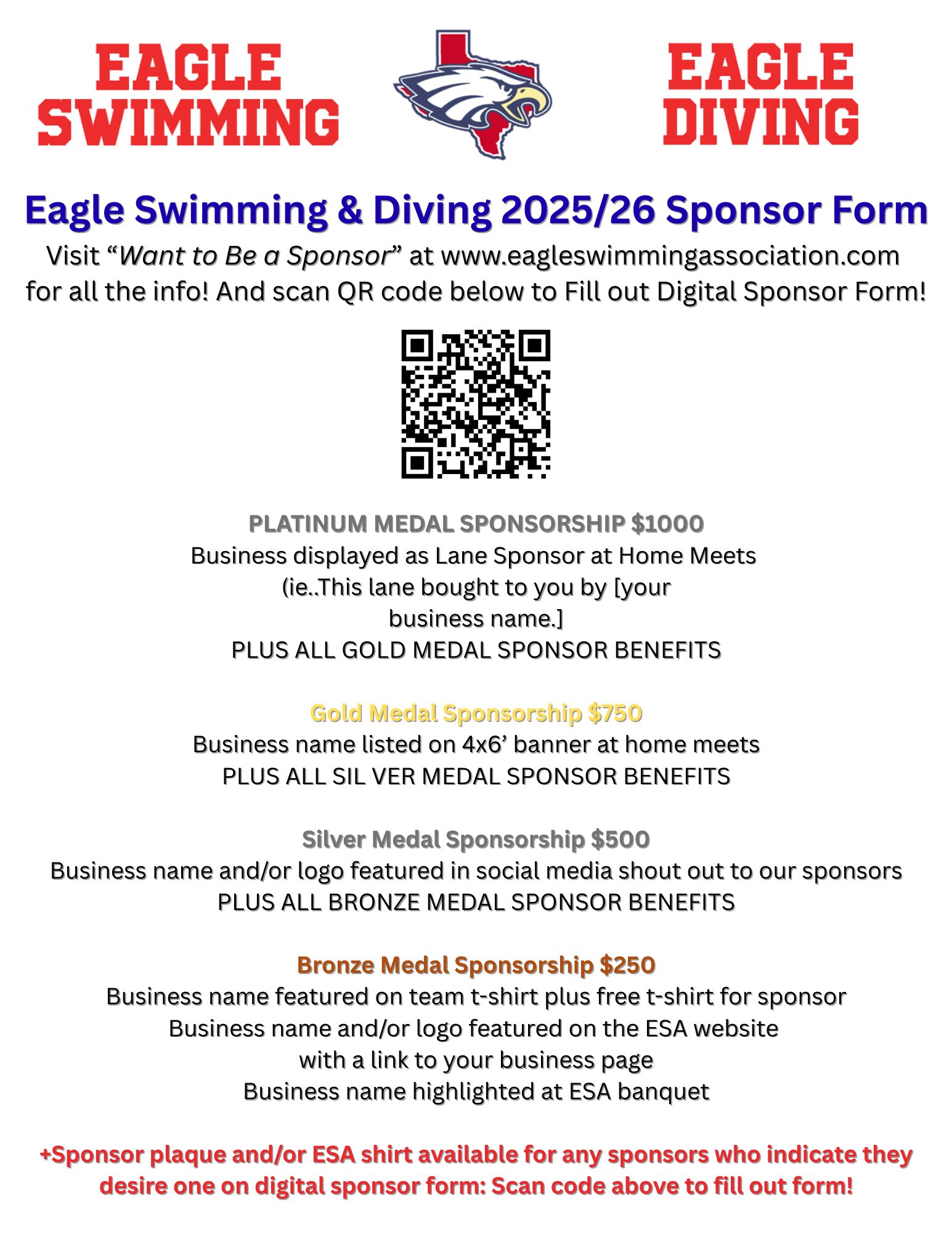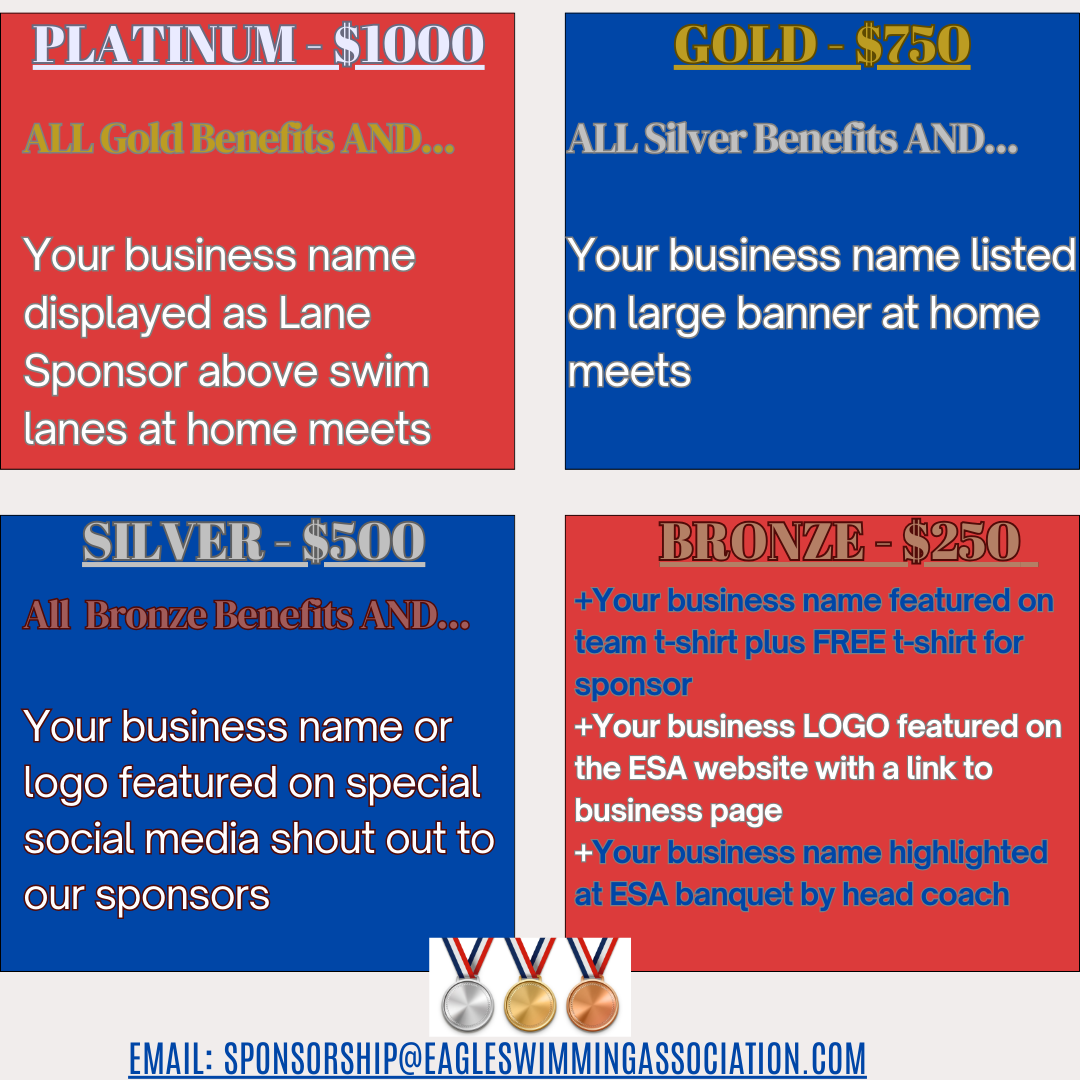 Thank you for your willingness to sponsor ESA Swim and Dive for the 2025/2026 season! All sponsor levels and information are listed below.