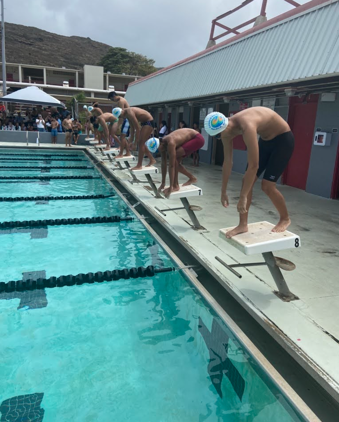 On the day of the meet, swimmers sit with their teams. Captains organize the swimmers and tell them when to swim.