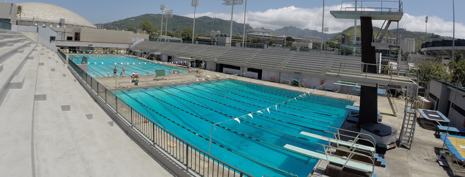 The Duke Kahanamoku Aquatic Complex (DKAC) serves as the home for the University of Hawai‘i’s swimming and diving, women’s water polo, and UH Masters swimming teams. The facility, located on the University’s lower campus, includes a 50-meter training pool and a separate 25-yard competition and diving pool. The long course pool is four feet at both ends, seven feet in the middle, and an average depth of six feet.