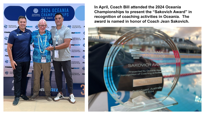Coach Bill then traveled to the Australian Gold Coast to present the "Savokich Award" to Horst Meihi at teh 2024 Oceania Championships. This award, named in honor of Coach Jean, recognizes coaching activities throughout Oceania.