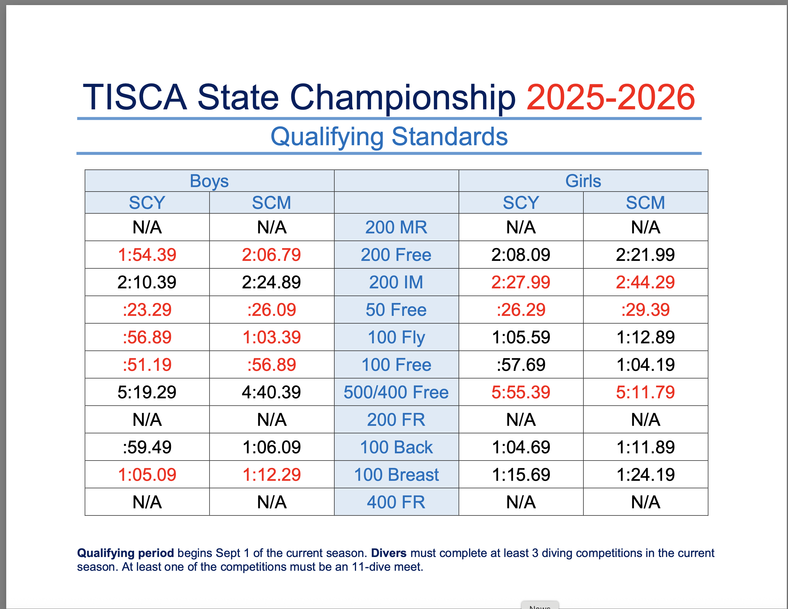 Meets considered eligible for achieving qualifying times are all Shelby County seasonal meets and high school meets outside of Shelby County run with officials and published results. Swimmers must have swum the event at a Shelby County Swim League meet to be eligible to swim that event at County. Times from a USA sanctioned during the 2025-2026 season meet may be used ONLY If that event was swum during a SCSL meet. Swimmers cannot enter an event that was only swum at a USA meet. Qualifying times can be found on the link under the High School tab.