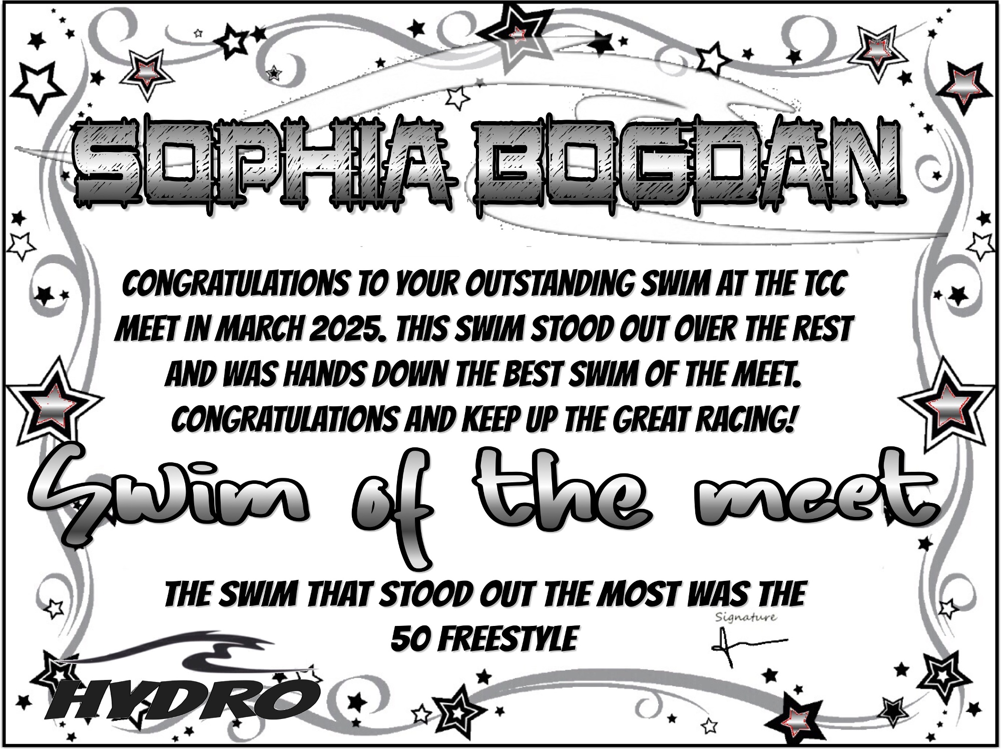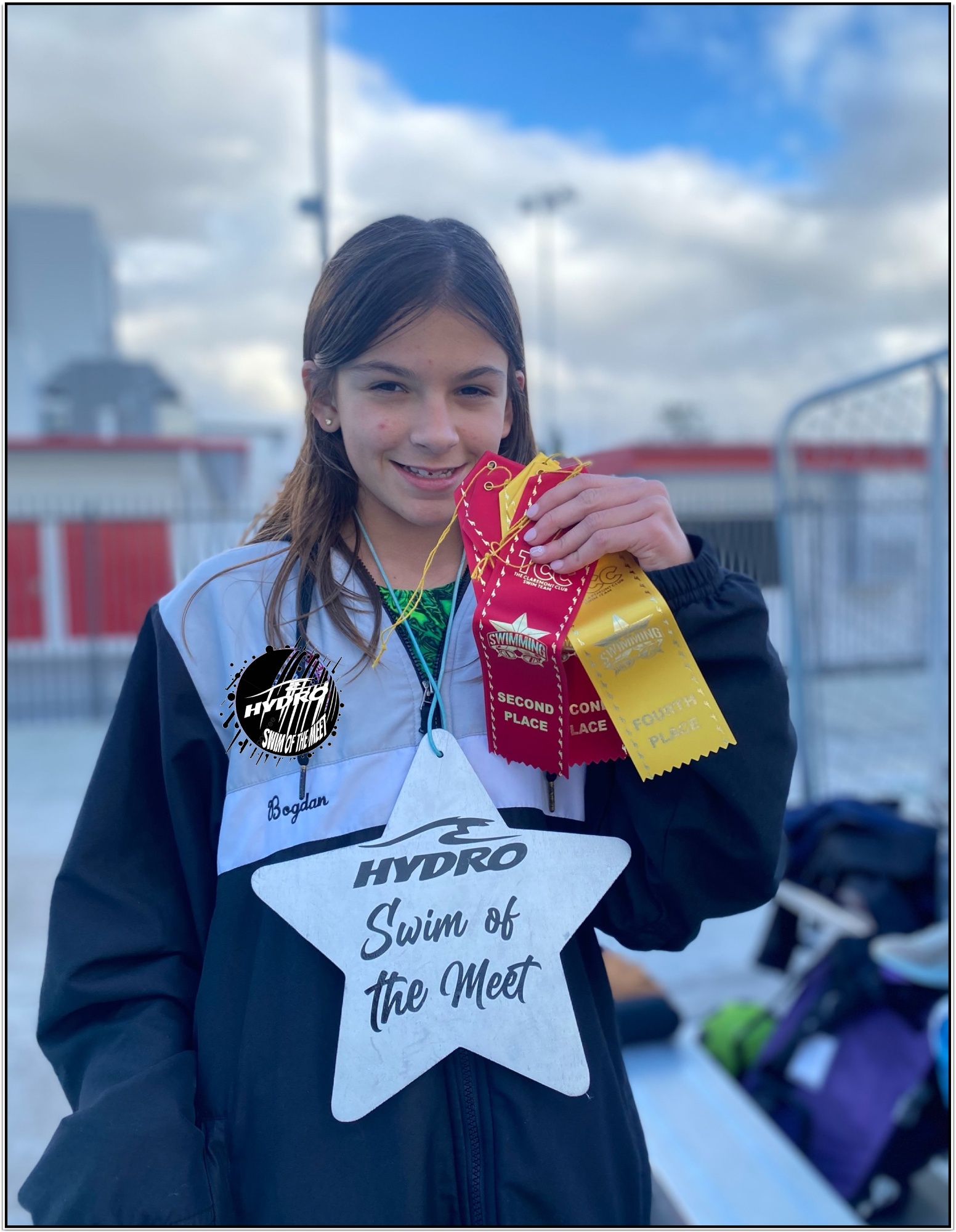 Our swim of the meet for Gold goes to Sophia Bogdan for her efforts in the 50 freestyle. Sophia had a good meet and it could have went to many of her swims. It just so happened to be the 50 free that stood out the most. Sophia had a entry time of 31.81 and swam a 31.40 dropping .41 seconds.