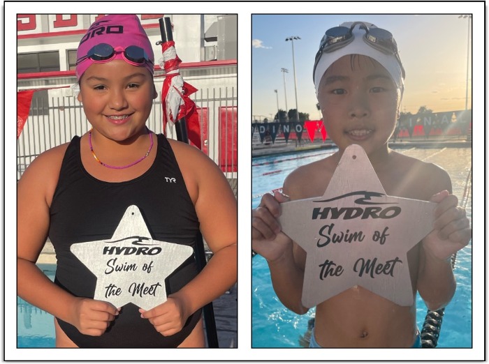 Swim of the meet goes to 2 Hydro athletes. On the left we have Aubree Salgado and she is starting to specialize in the 200 freestyle. She won the event with the time of 2:54.89 and dropping a huge 8.86 seconds.
