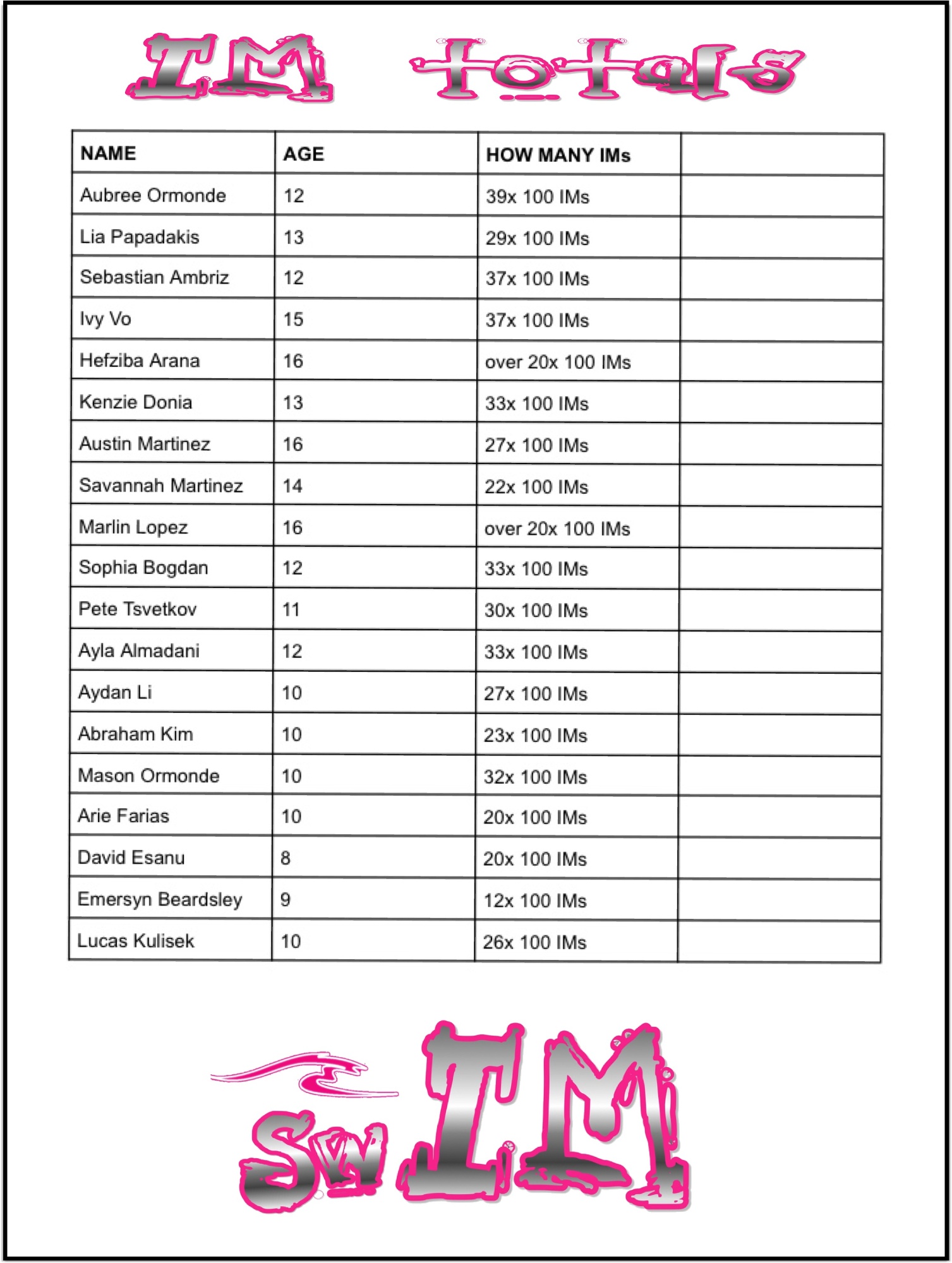 Wow!! Wow!!! Wow!!! I am super impressed with the hardcore swimming that took place yesterday. We had some outstanding swims by all! If you/your swimmer did over 16.5 X 100 IMs then they swam over 1 mile of 100 IMs and it’s safe to say all or most made the mile mark! I have ordered the caps for the ones that attended and your sticker for completion was given at the finish. Now it’s time to go get your pledges, donations, let your family know how many laps you did. The list and names are attached to this message and I will send you each an individual official letter stating you completed the amount of 100 IMs completed. Again great swimming to Aubree, Lia, Sebastian, Ivy, Hefziba, Kenize, Austin, Savannah, Marlin, Sophia, Pete, Ayla, Aydan, Abraham, Arie, David, Emersyn, Mason and Lucas. We have our make up date next week on June 5th (we will run regular practice along side of this) 6-8 pm for the ones that couldn’t make it to this one.