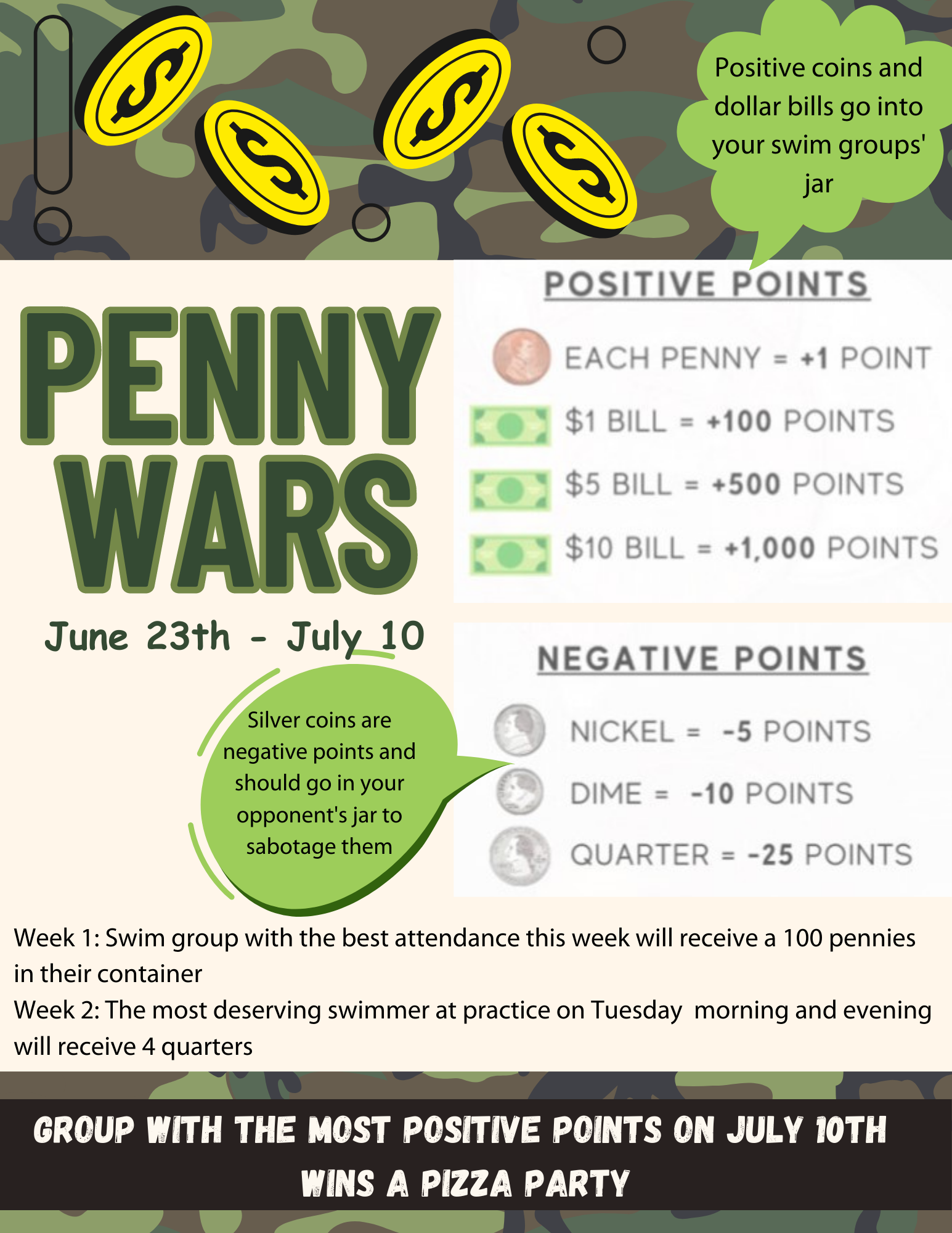 Swimmers bring your pennies and dollar bills and put them in YOUR swim group's container. Quarters, dimes, and nickles will take away from the group's total and should NOT be put in your swim group's container - put those in another group's container.
