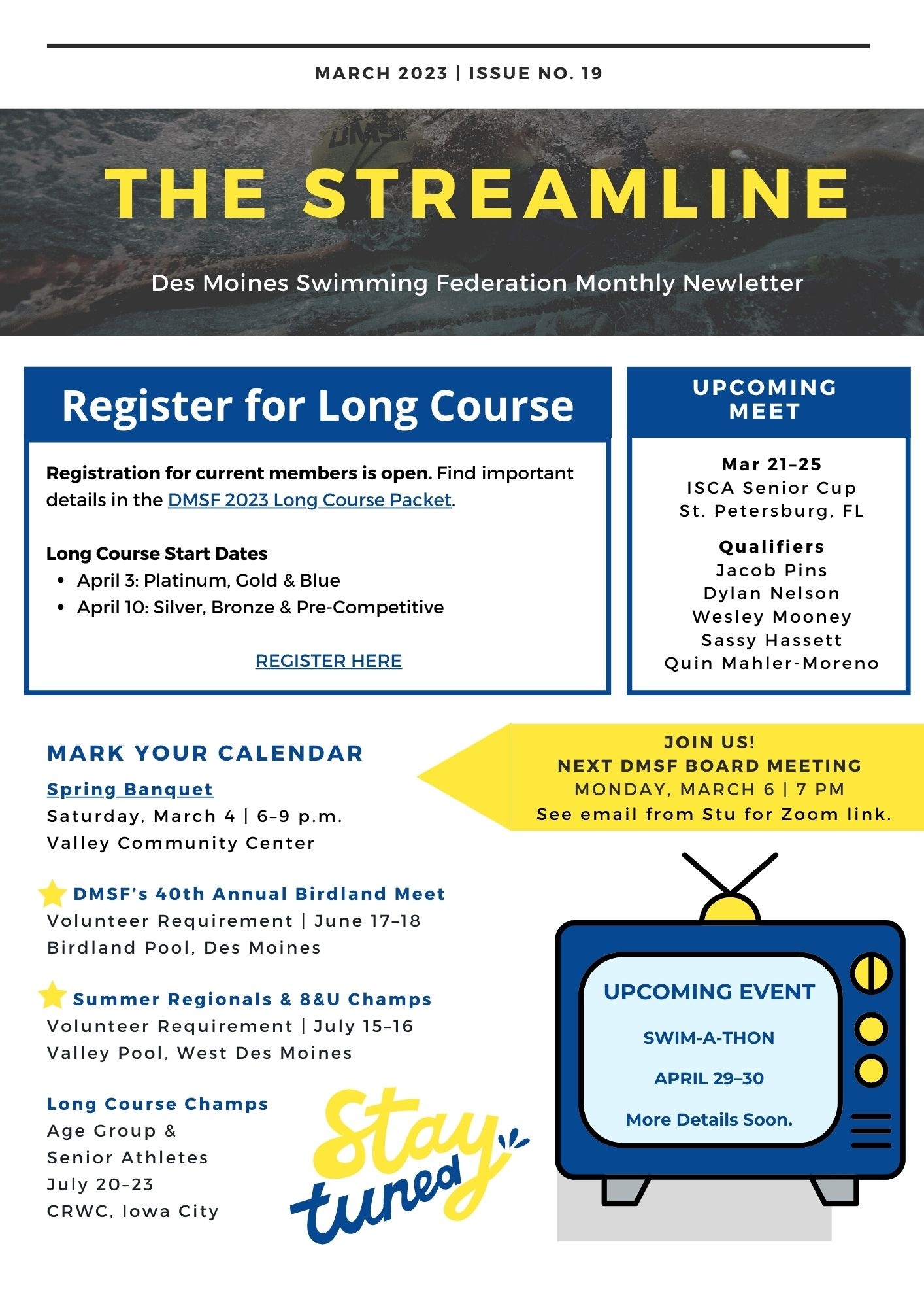 See what's coming up as we approach long course season, and view photos from recent championship meets,