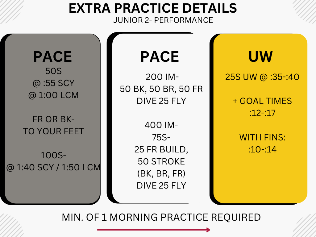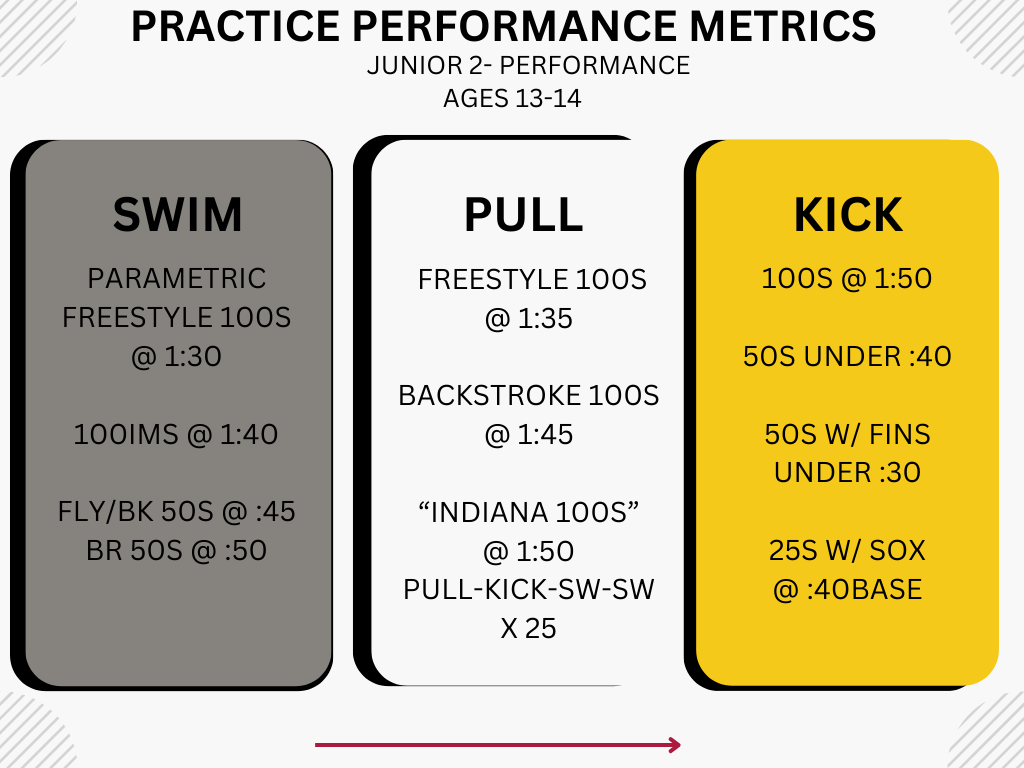 Practice Objectives: The suggested age for this group is 13-14 years old, who have achieved an IASI Q times. This group is designed for swimmers who are highly motivated and committed to 6-8 practices per week. In addition, swimmers will participate in dryland as part of their competitive conditioning.