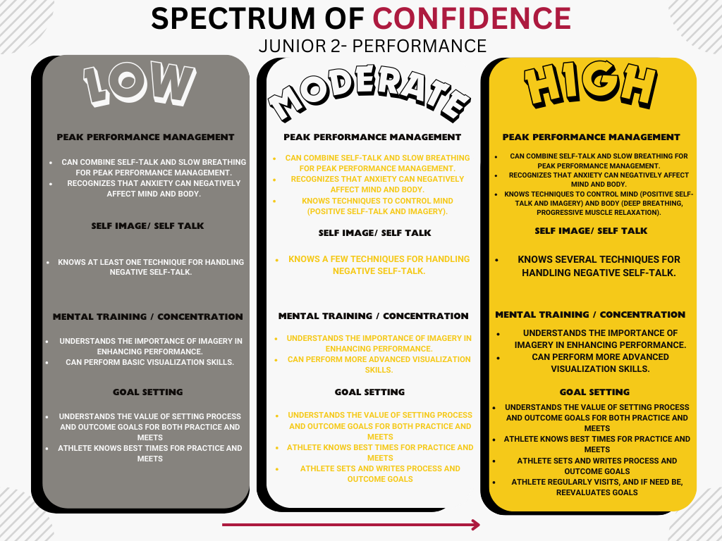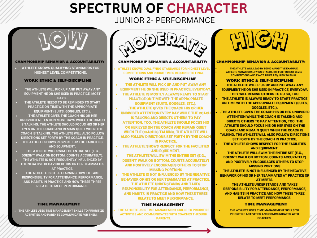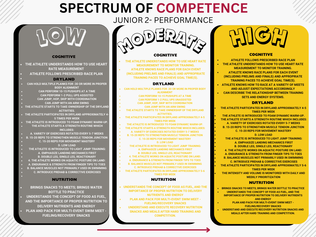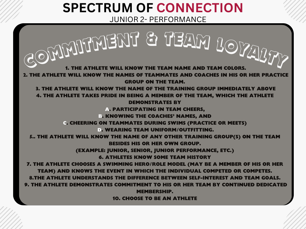 Advancement: Please see the Performance, Character, Competence, Confidence, & Connection Metrics for SR1 or SR2:P . Our group progression is based on the AMERICAN DEVELOPMENT MODEL. Participation in all sanctioned swim meets each season is preferred for JR2:P
