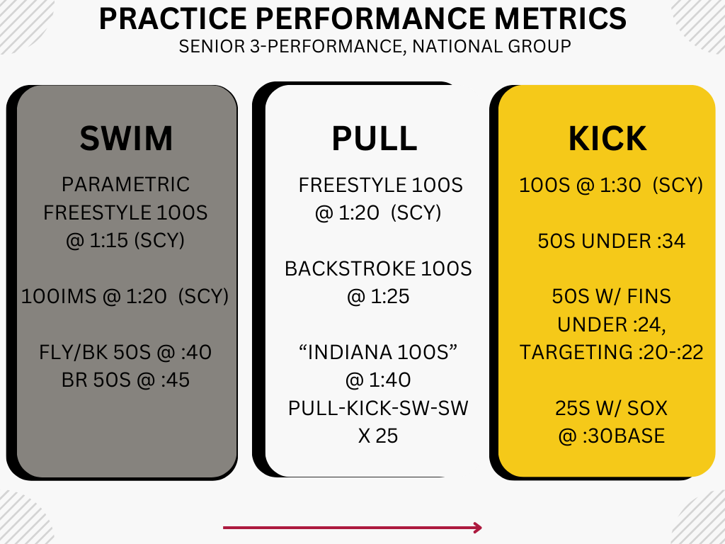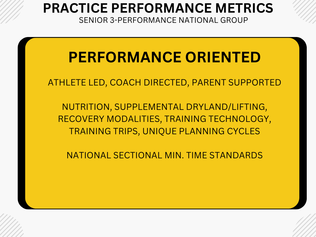 Practice Objectives: The suggested age for this group is 15 years old and older or a freshman in high school, who have achieved, at minimum, Spring Sectional times. This group is designed for swimmers who are highly motivated and committed to 7-9 practices per week. In addition, swimmers will participate in dryland & a weight training program as part of their competitive conditioning.