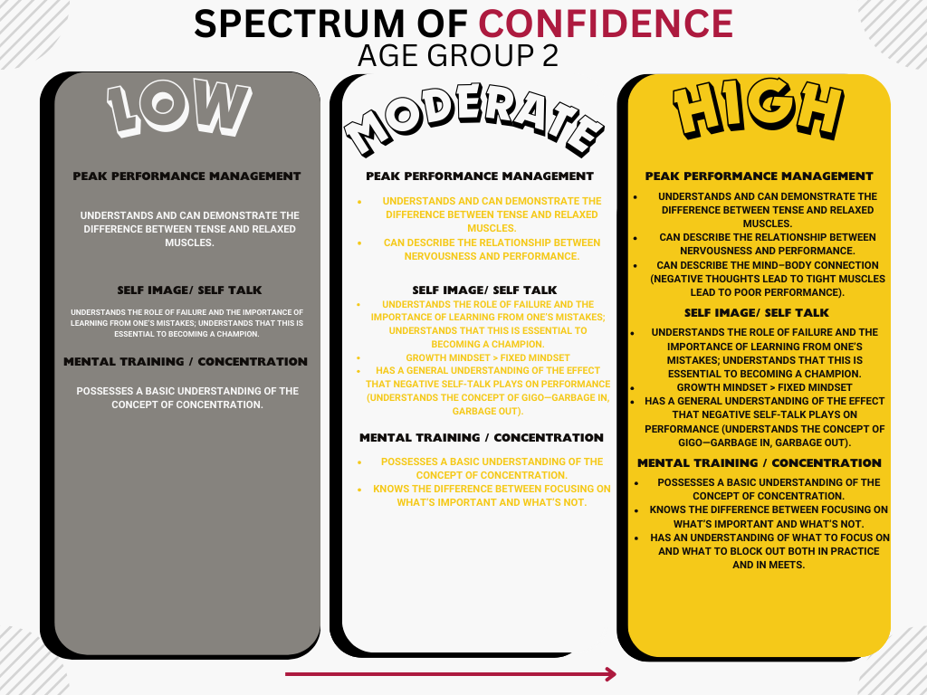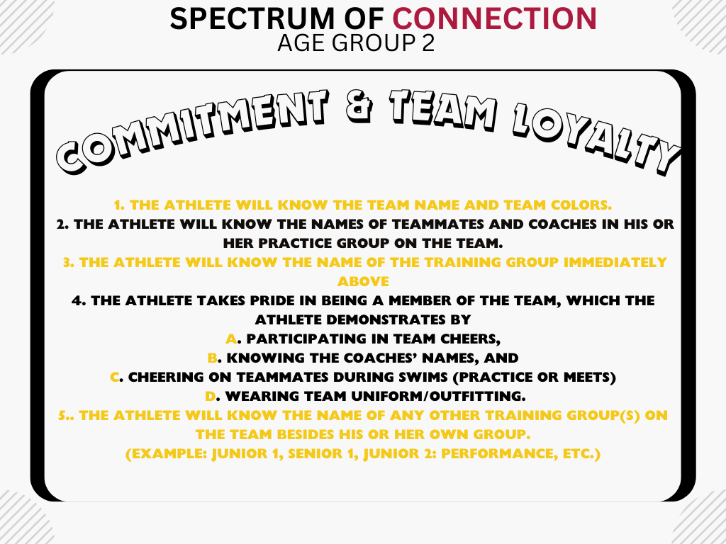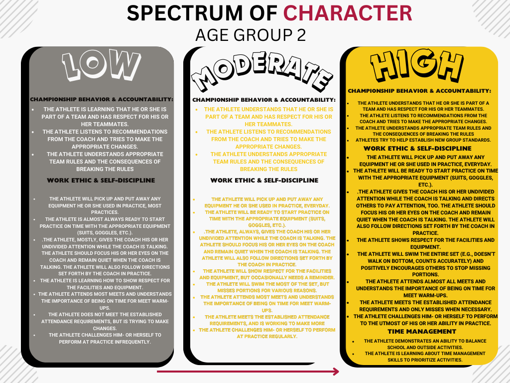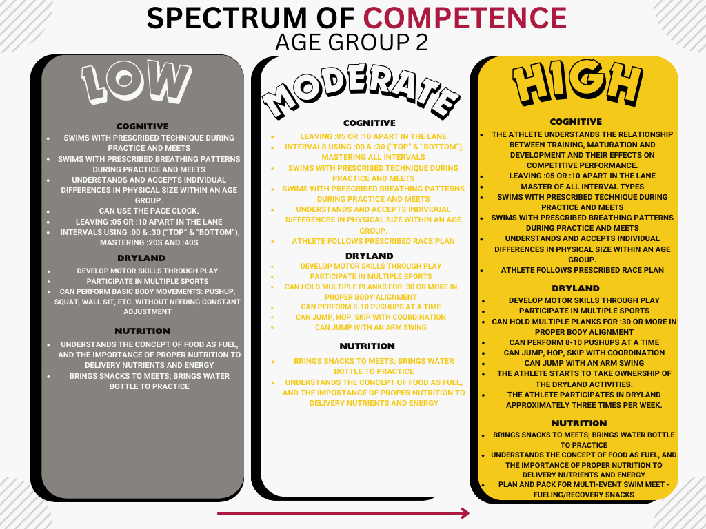 Advancement: Please see the Performance, Character, Competence, Confidence, & Connection Metrics for JR1 or JR2:P . Our group progression is based on the AMERICAN DEVELOPMENT MODEL. Participation in most sanctioned swim meets each season is preferred for AG2.