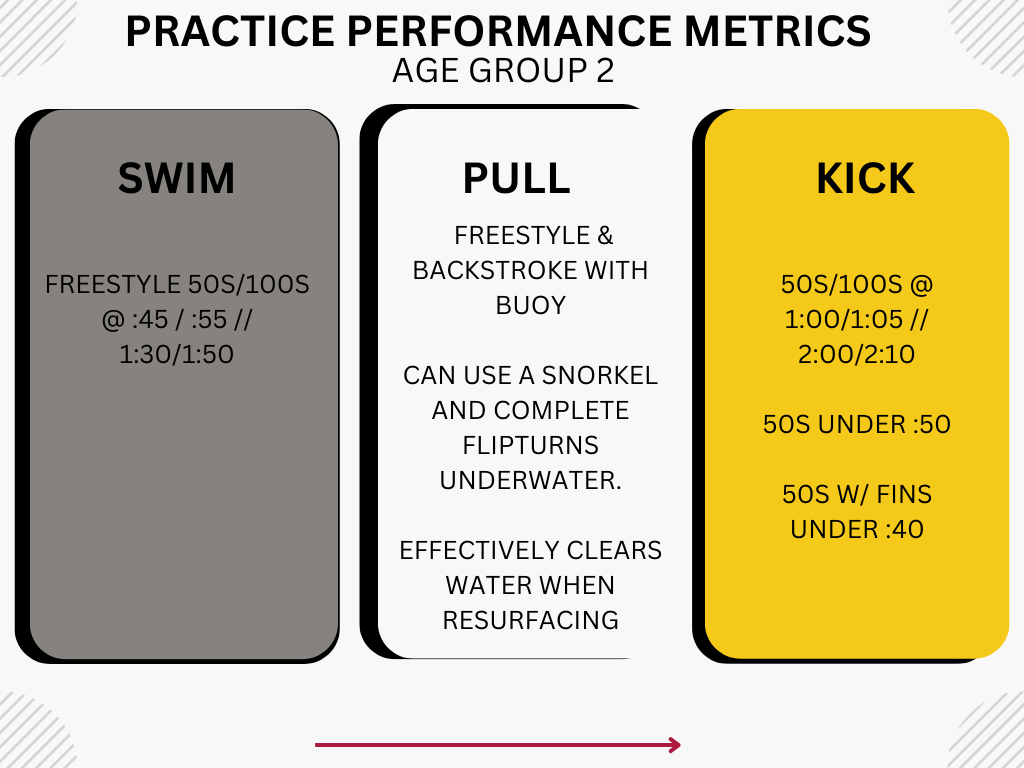 Practice Objectives: The suggested age for this group is 11-12 years old. Athletes will continue to master the five competitive strokes and race skills. Swimmers will work on proper technique and build endurance during their practice sessions. Swim meet competition is encouraged as a fun and positive part of the swimming experience. Coaches will help each swimmer set goal times appropriate to his or her current skill level, with personal improvement as the primary focus.
