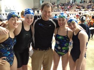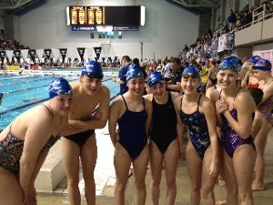 Karen Kiehl came for 4 relays and some time trials and sure made the trip worth it! She raced an awesome 100 back leg of the realy, experimenting with some extra underwater kicking. Karen Kiehl swam great splits on the girls relays (best time in the 50 free by .5), and then dropped over a second in the 100 Free! Karen Kiehl, Ashley Christoff, Meghan Merrick, and Alli Bumann all combined to raced the 4 relays. The 200 MR was DQ'd, the 400 Medly was 17th, the 200 Free was 16th, and the 400 Free was 14th. Now on to Sr. Zones and college!