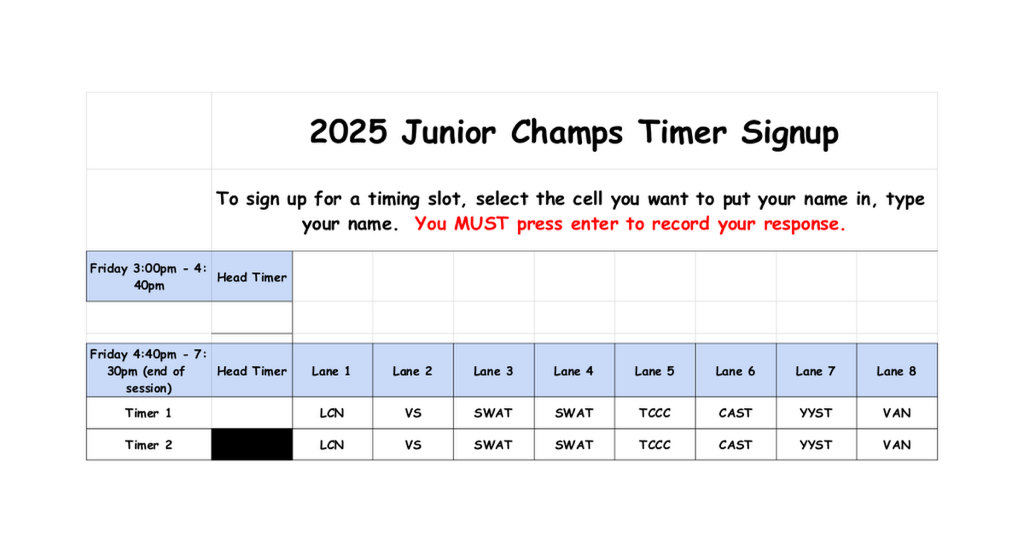 SWAT has been assigned several lanes for timing. Attached is the sign-up form. Please make sure we are spreading out the timing responsibilities. We don’t want one family or one person timing the entire time.
