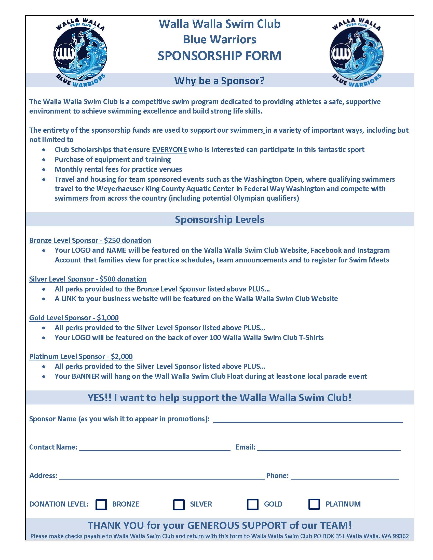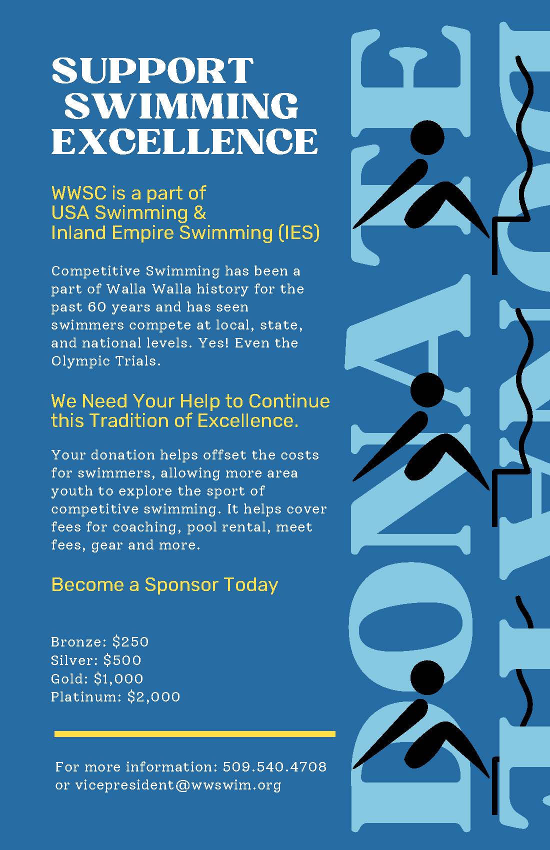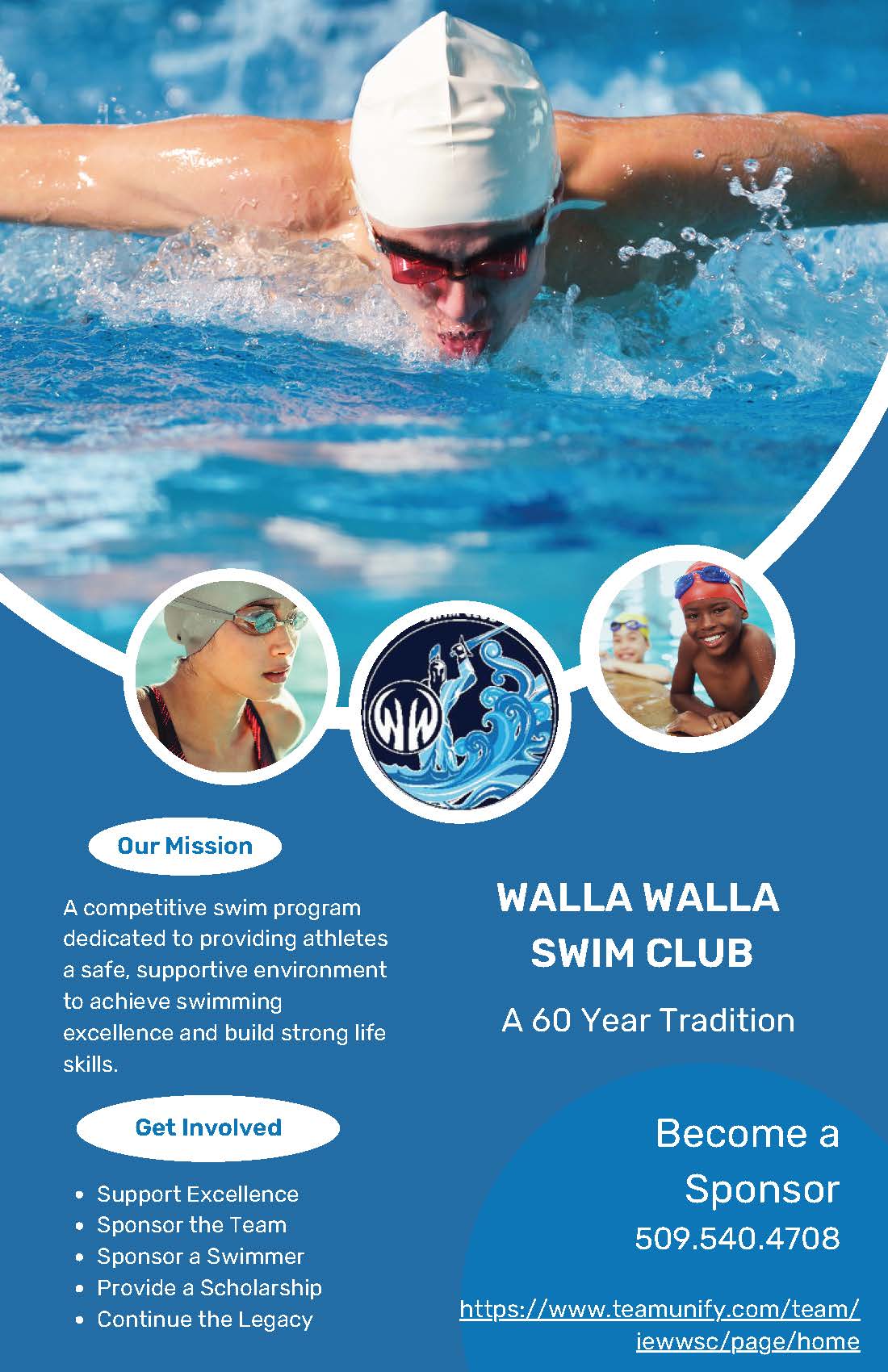 Thank you for your interest in becoming a sponsor for the Walla Walla Swim Club! Your support is vital for keeping our kids swimming. All the information you need is located on this page, but please don't hesitate to contact the WWSC Vice President with any additional questions.