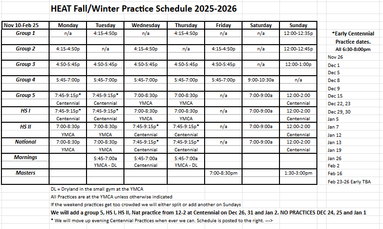 Fall/Winter 2025-2026 Practice Schedules (updated 12-19-25)