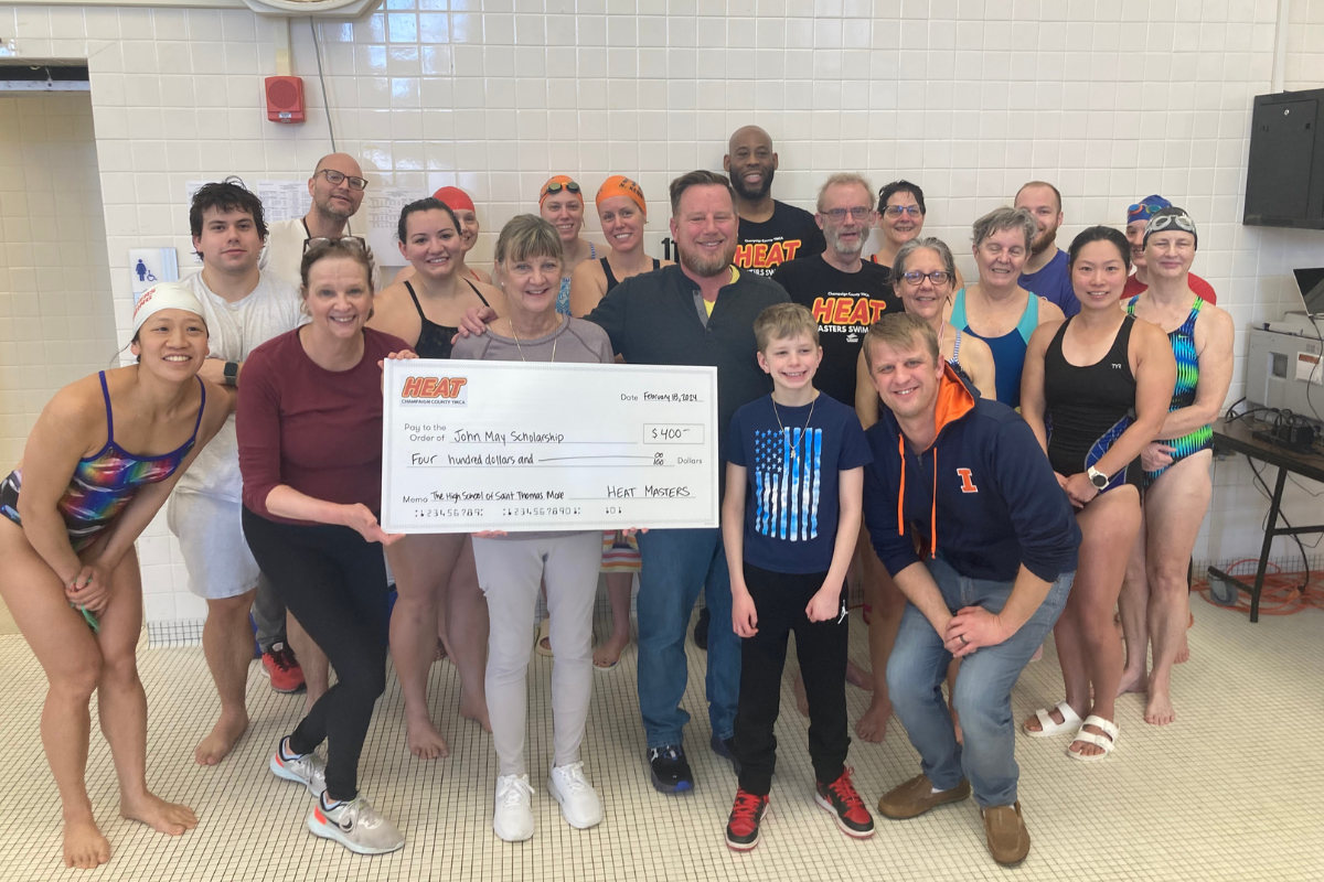Members of the May Family, including John’s wife Kathy, son Adam, and son Josh and his family were present at the swim meet. The swim team and the May Family took a photo along with a big celebratory check for the scholarship fund at Saint Thomas More. The Heat Masters Swim Team looks forward to honoring John’s legacy for years to come, and is already planning the next swim meet, set to take place in mid-February 2025.