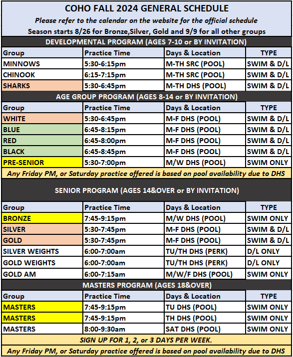 - COHO fees: These will be communicated out by our team treasurer. Please be on the look out for communication. All Swim Meets, and COHO events have fees associated to them that are not included in your DFPD registration.