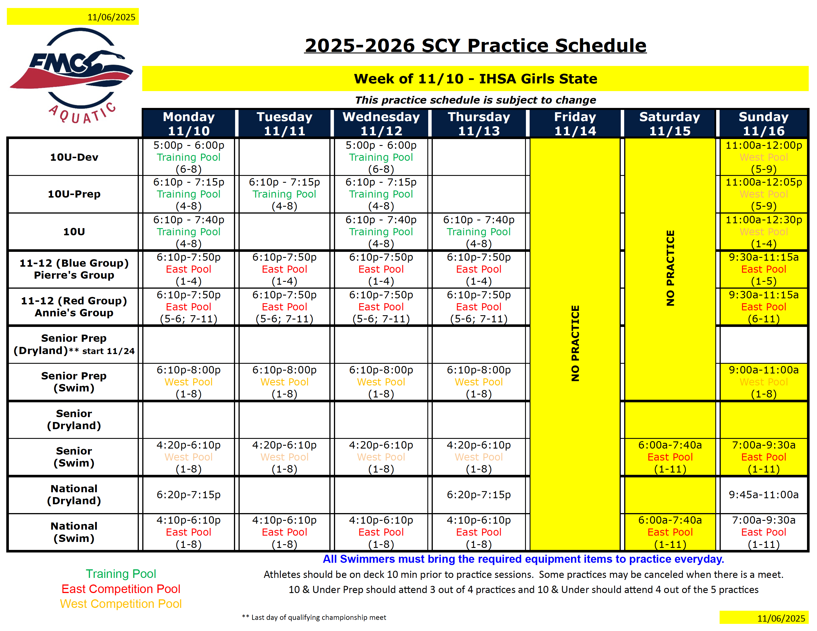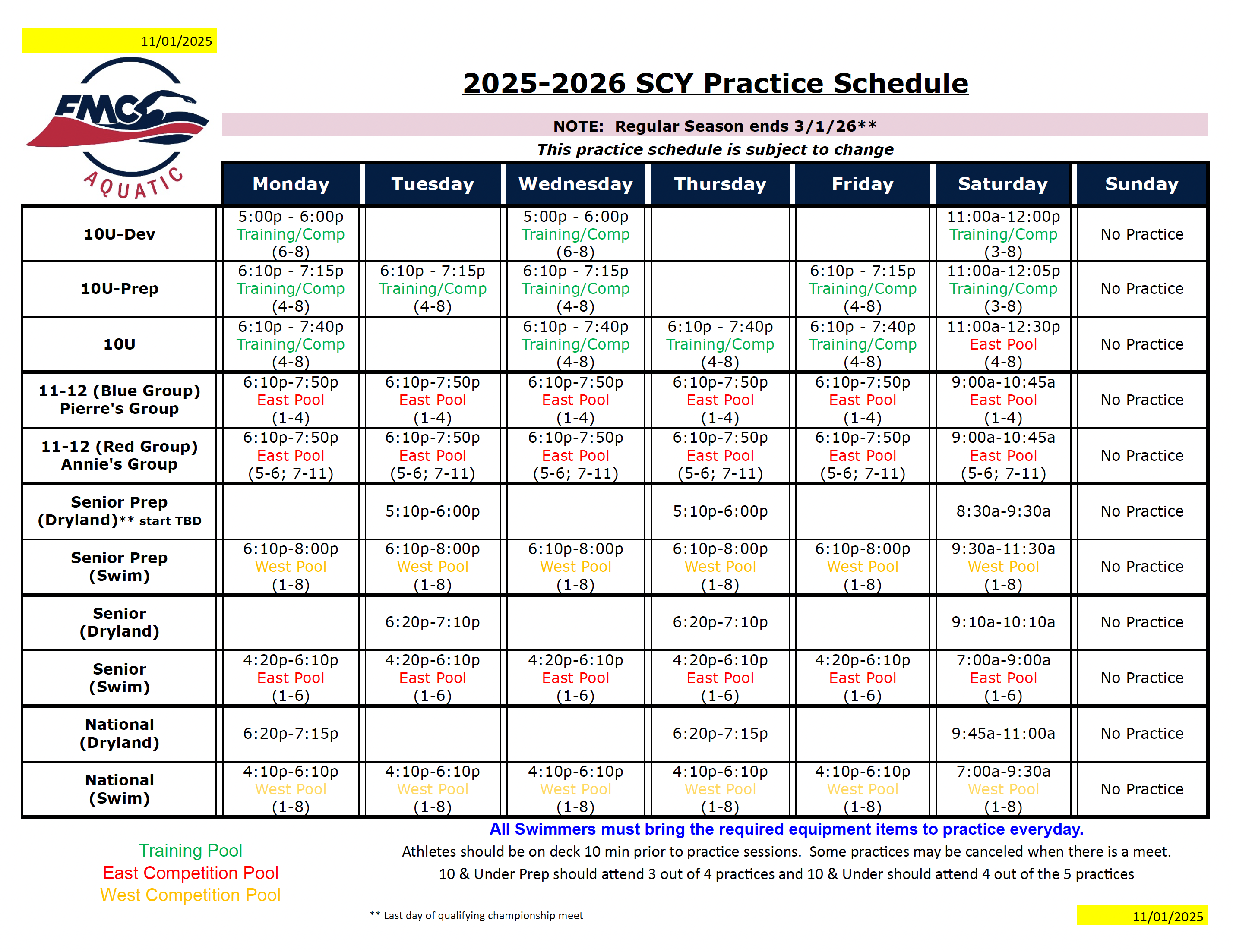 2025-2026 SCY Practice Schedule ** UPDATED 11/1/25 **