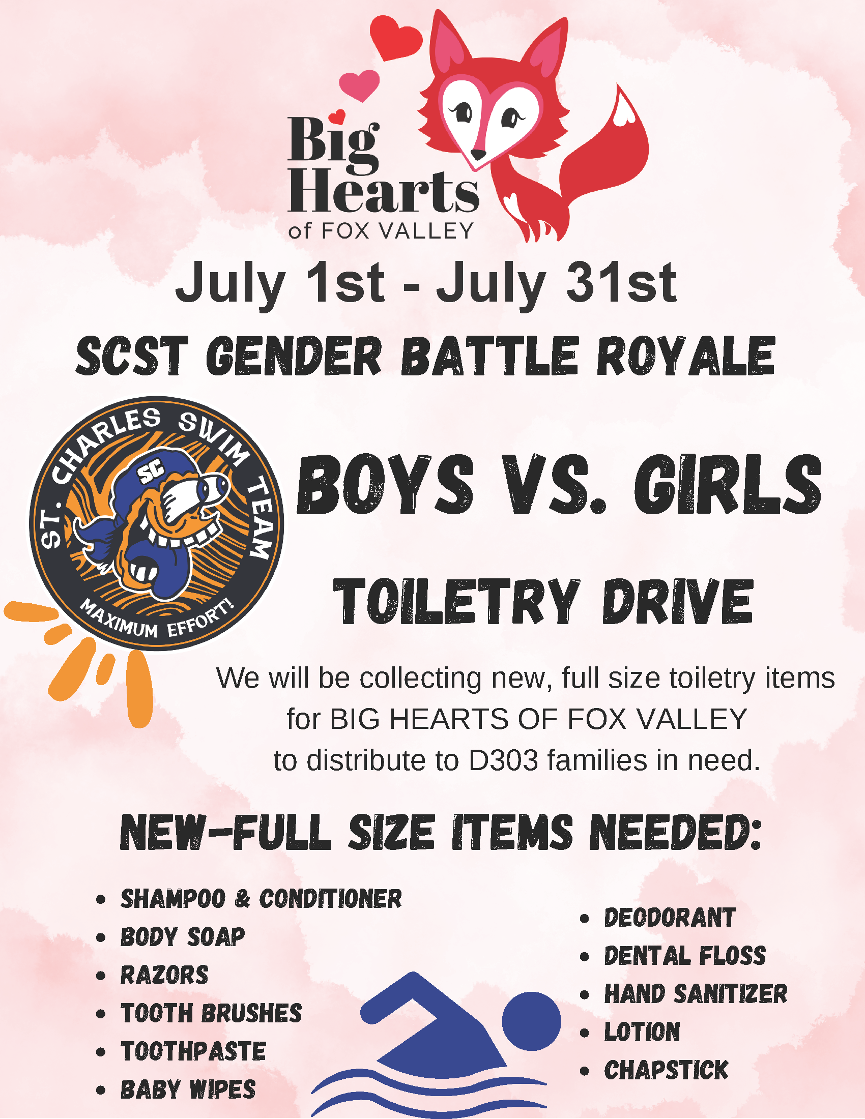 SCST will be collecting new, full size toiletry items for BIG HEARTS OF FOX VALLEY to distribute to D303 families in need.