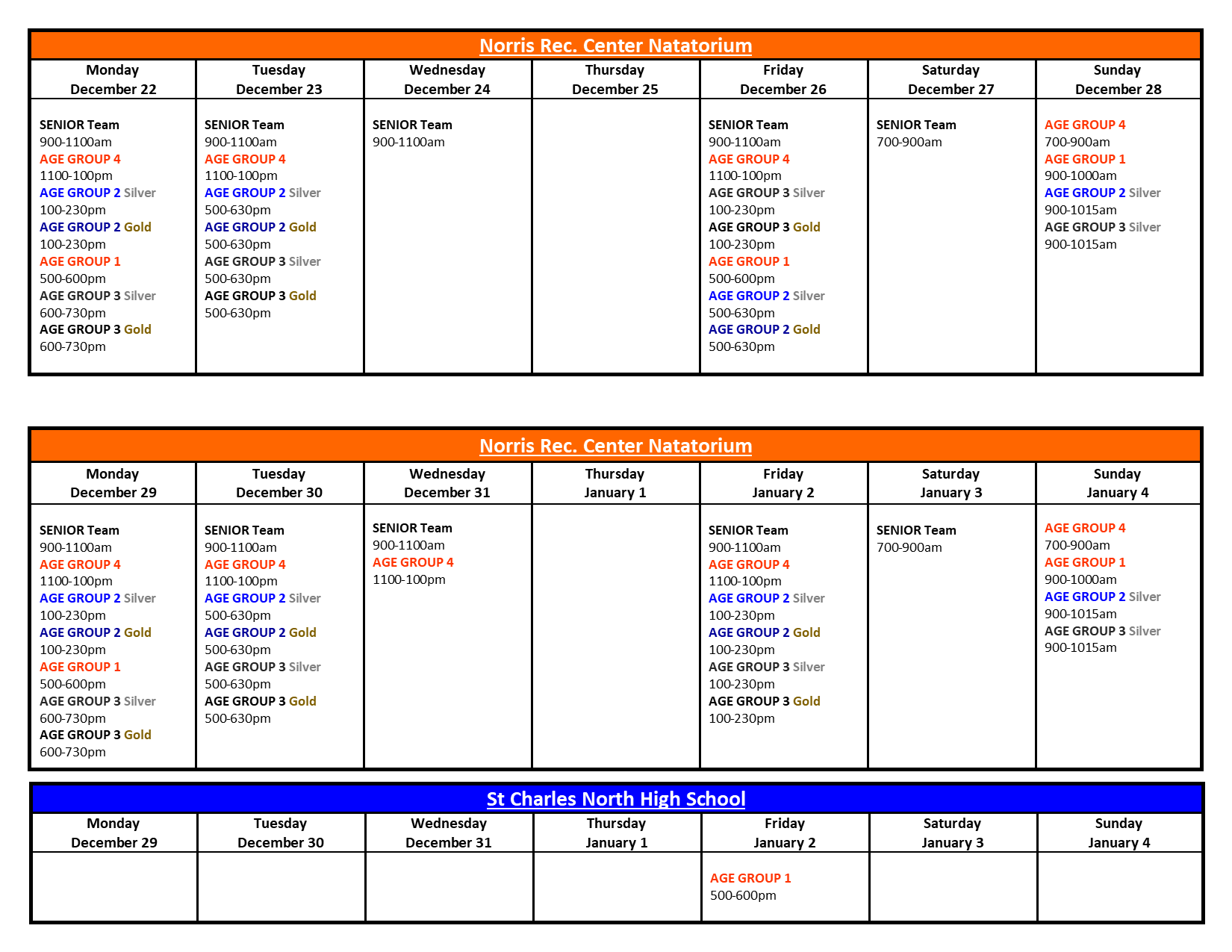 Our team is fortunate enough to have excellent facilities for training and meets. The Norris Center pool is a 6-lane, indoor 50-meter pool with the ability to convert to a 25 yard pool. The timing system is Daktronics with a 6-lane time display board. The pool ranges in depth from 3.4. deep to 12. deep at the starting end. This pool is also connected with St. Charles East High School. The Norris Center is located at 1050 Dunham Rd. St. Charles, IL, 60174. www.norrisrec.com