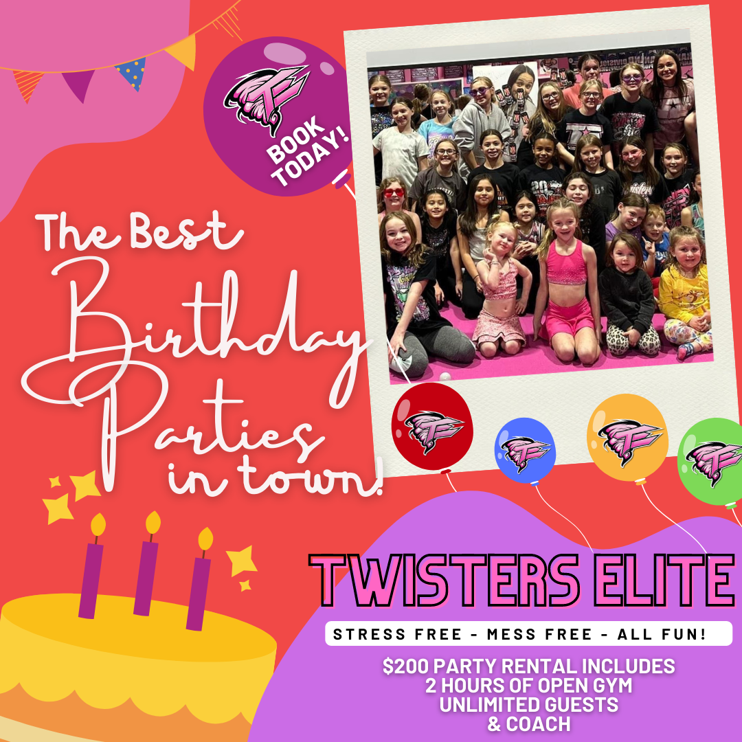 Book Your Birthday with Twisters! Friday Evenings, Saturdays after 3pm and Sundays are typically wide open! You do not need to be a team member to book a party. To book your spot,  email [email protected]