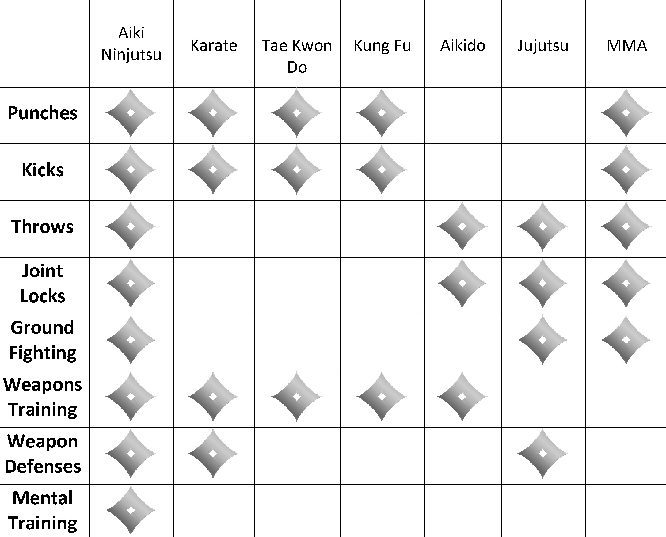 Aiki Ninjutsu was formed to bring the teachings of twelve systems of Japanese martial arts together for the modern world. These twelve systems were used by the Samurai and Ninja warriors of Japan and give us many principles and secrets that can aid a person to defend against a much larger, faster opponent who is unarmed or armed as well as defending against multiple attackers.