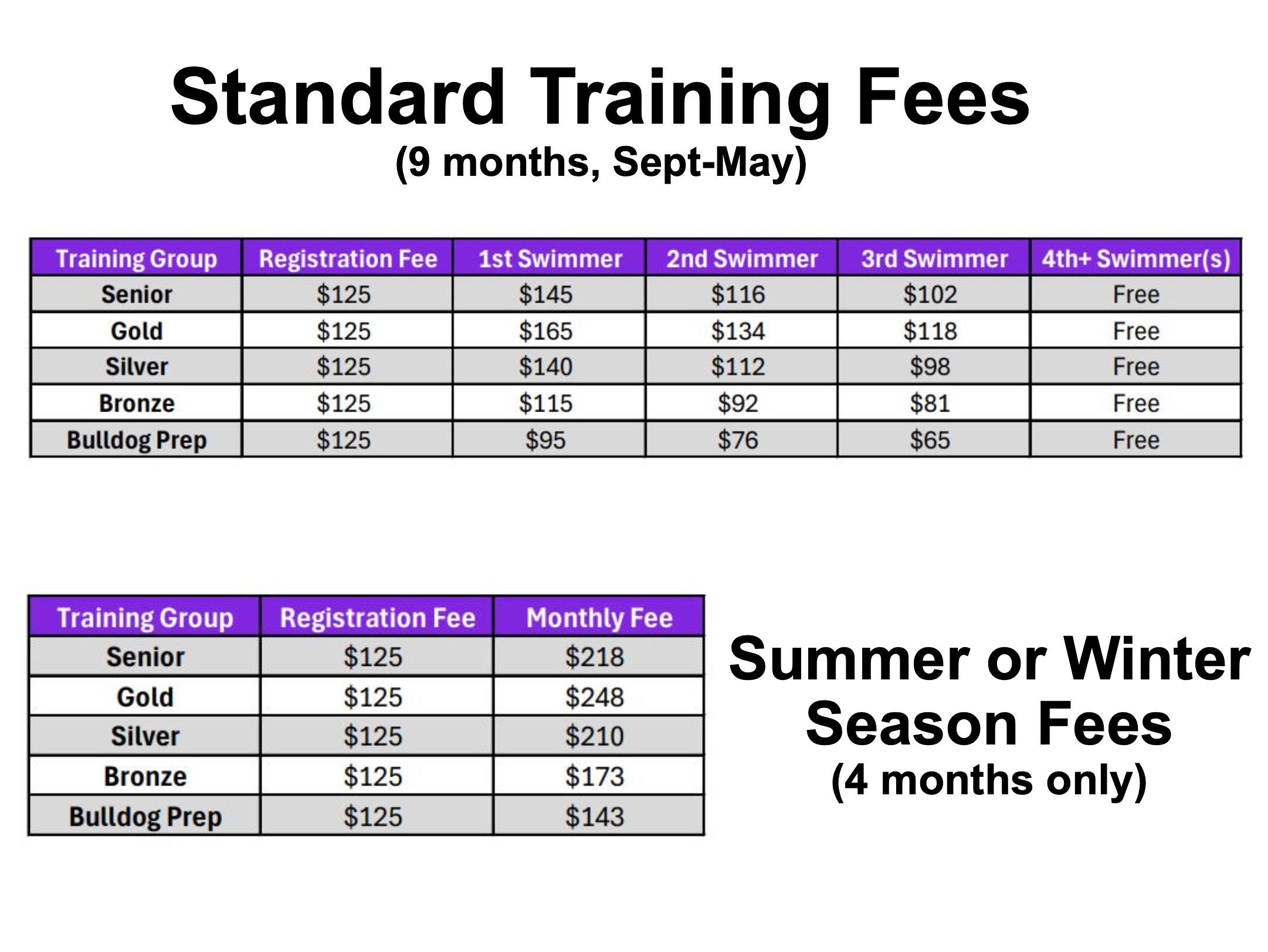 Fees vary by Training Group and are non-refundable. Training fees are paid monthly in 9 payments for year-round swimmers. Dues are billed on the first of each month, September - May.