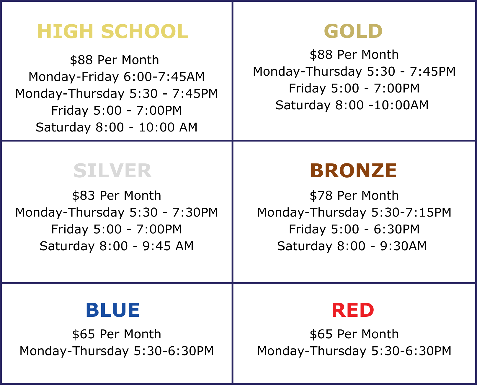 (Please note Oct - Feb is High School Swimming and we often have schedule changes due to swim meets. We will send emails when those changes occur.)