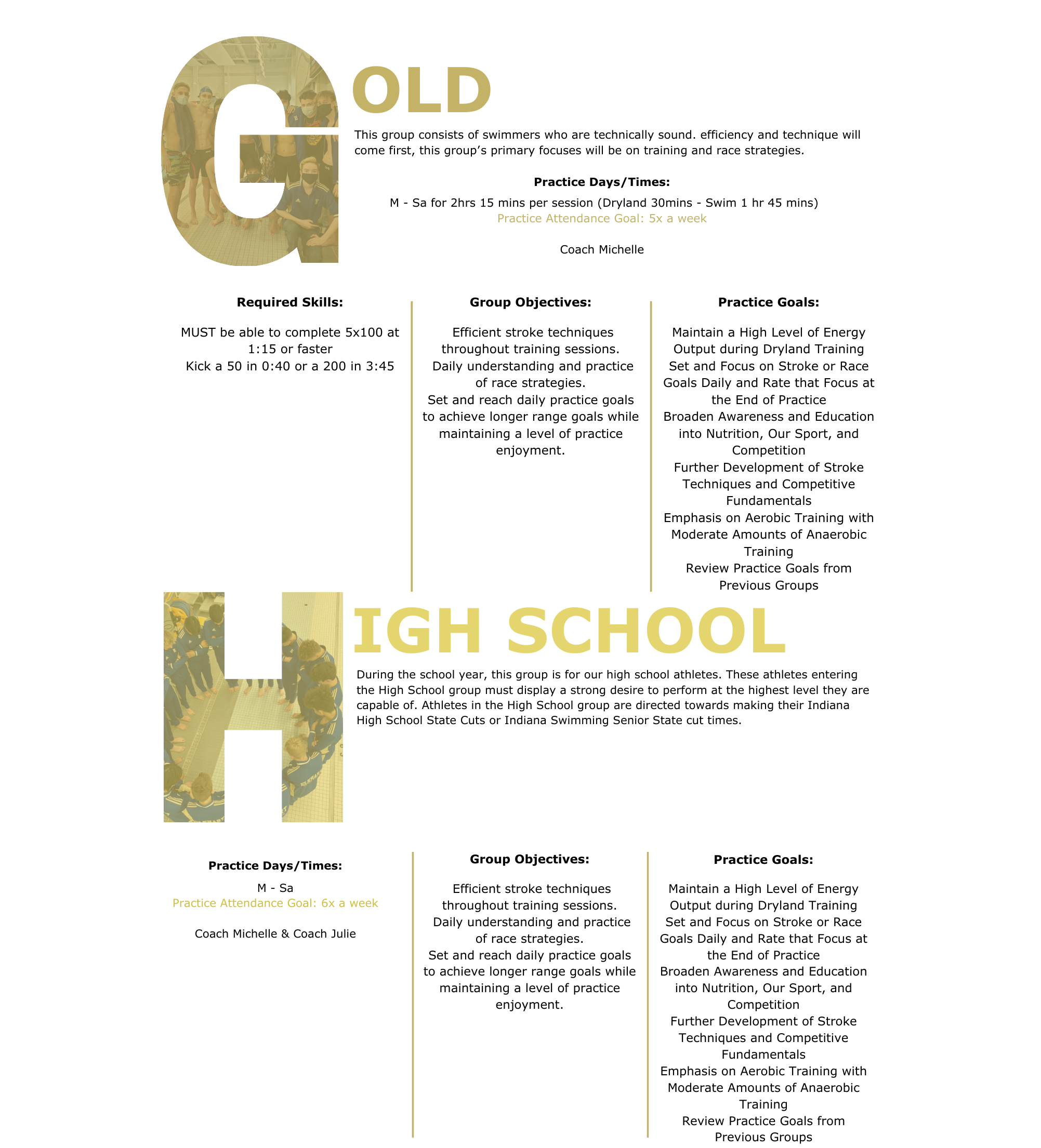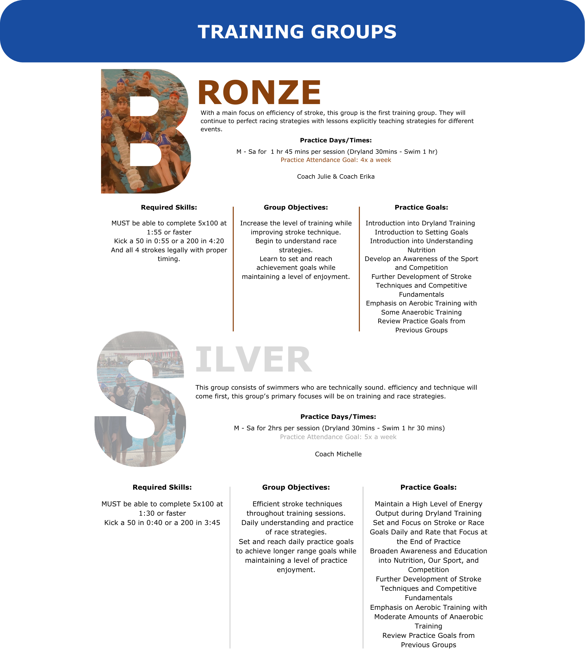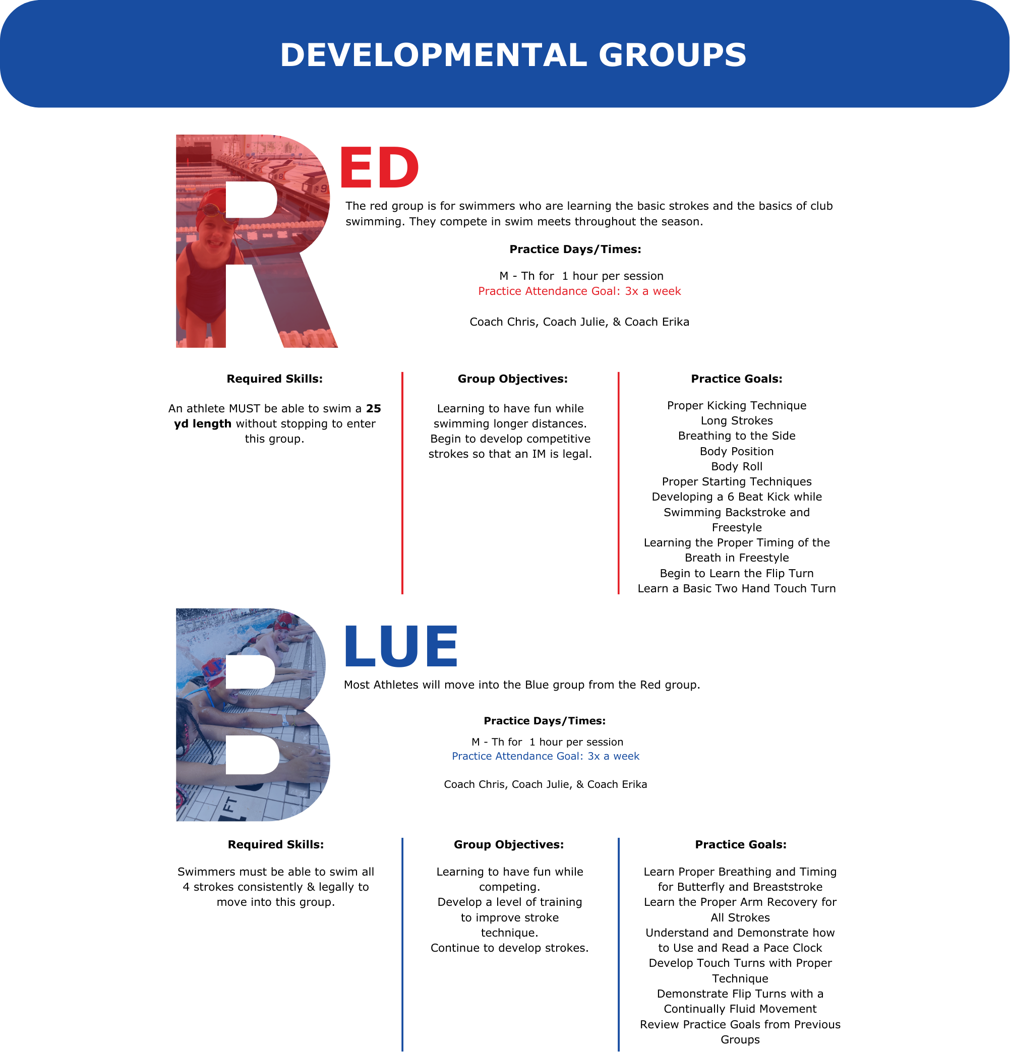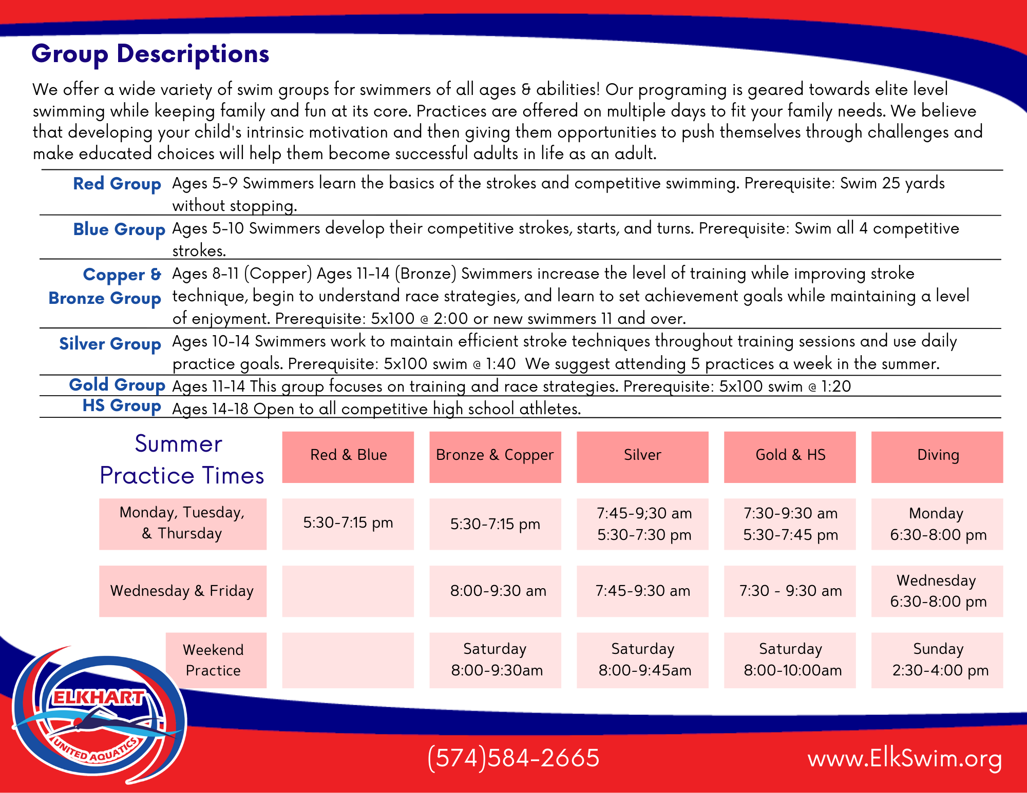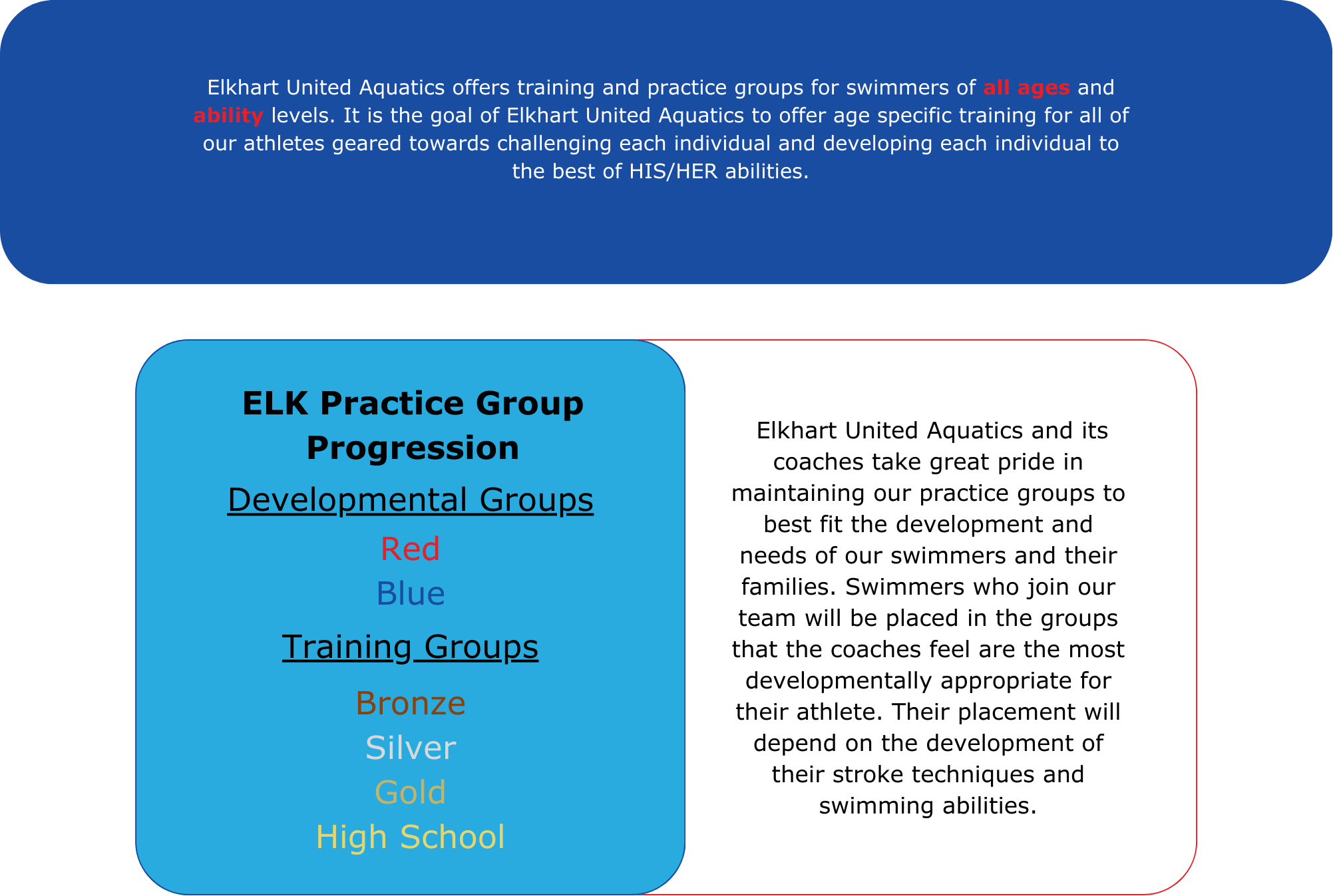 This is a guideline that ELK will use to group swimmers. Sometimes there must be exceptions. These will be under the coaching staff’s discretion. All exceptions will be made in an effort to do what is best for the athlete.