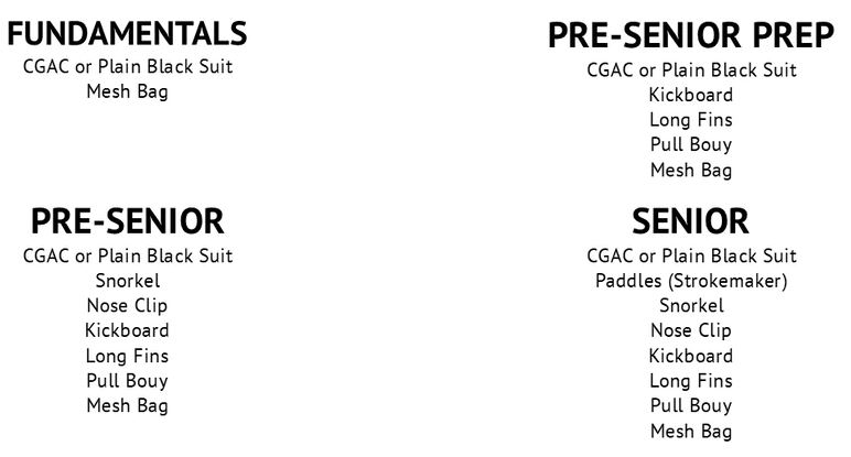 Each practice group has required equipment. This equipment should be present at every practice. Extra kick boards and pull buoys are available at CGHS pool site for use by any swimmer.