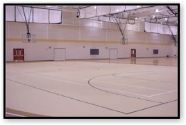 The image shows the area we use for swimmer camping. It has 3 gym floors, allowing plenty of space. The 2 doors you see in this picture lead directly to the swimming balcony and locker rooms. The gym is also PA system accessible.