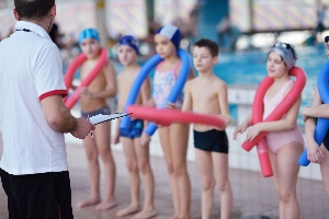 Relays - a swimming event in which four swimmers participate as a relay team, each swimmer swimming an equal distance of the race.