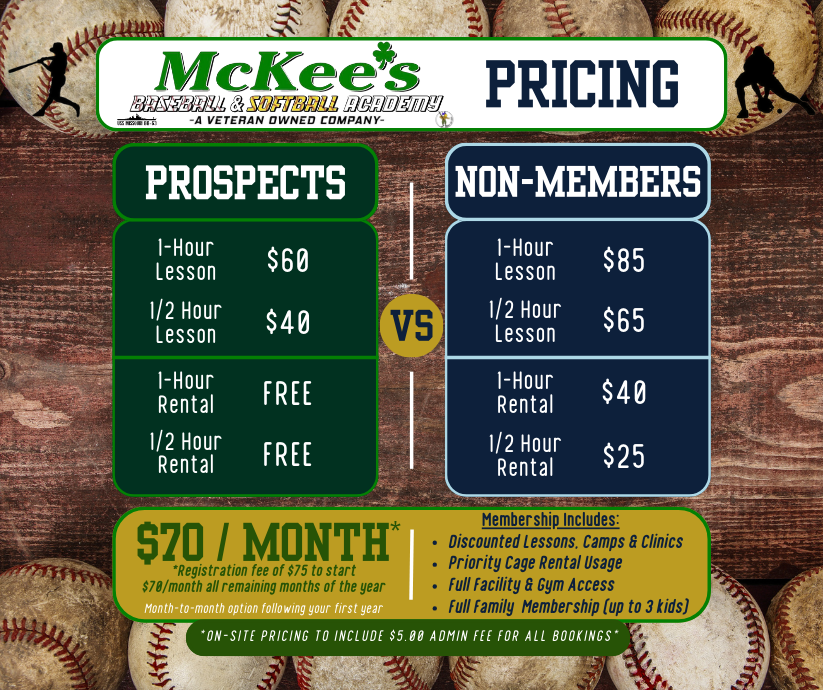 A membership at McKee's is your all-access pass to elite training and unmatched value! Prospects enjoy exclusive discounts on lessons, camps, and clinics, giving you affordable access to top-tier instruction. With full facility access, including pitching machines and batting cage rentals, you’ll have everything you need to elevate your game. Whether you're honing your skills or preparing for the next level, a McKee's, membership ensures you have the tools, support, and opportunities to succeed!