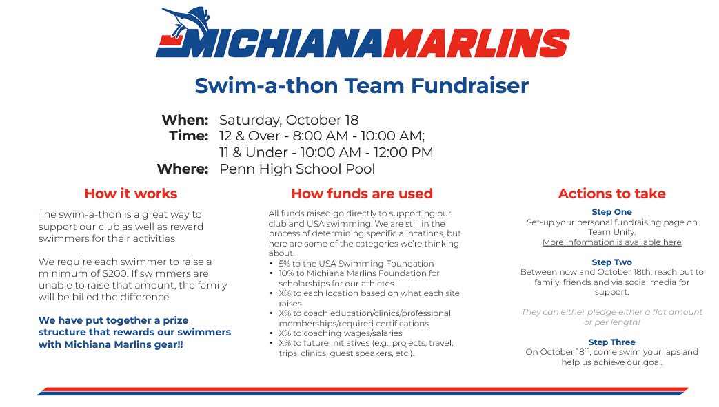 Here is brief overview of our upcoming Swim A Thon. A couple of changes, our times for 12 and overs will be from 8:00-10:00 and the 11 and unders will be from 10:00-12:00. Here is the link to set-up your athlete's personal fundraising page.